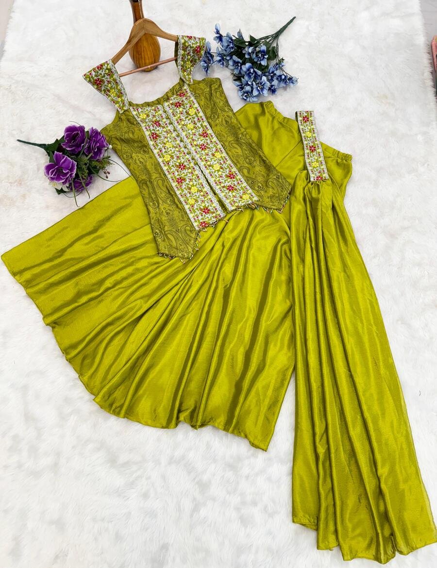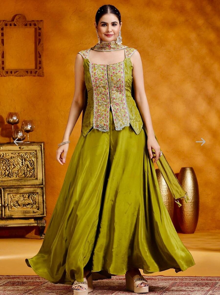DESIGNER CHINON MULTICOLOR EMBROIDERY SEQUENCE WORK TOP PALAZZO WITH FANCY DUPATTA PARROT GREEN