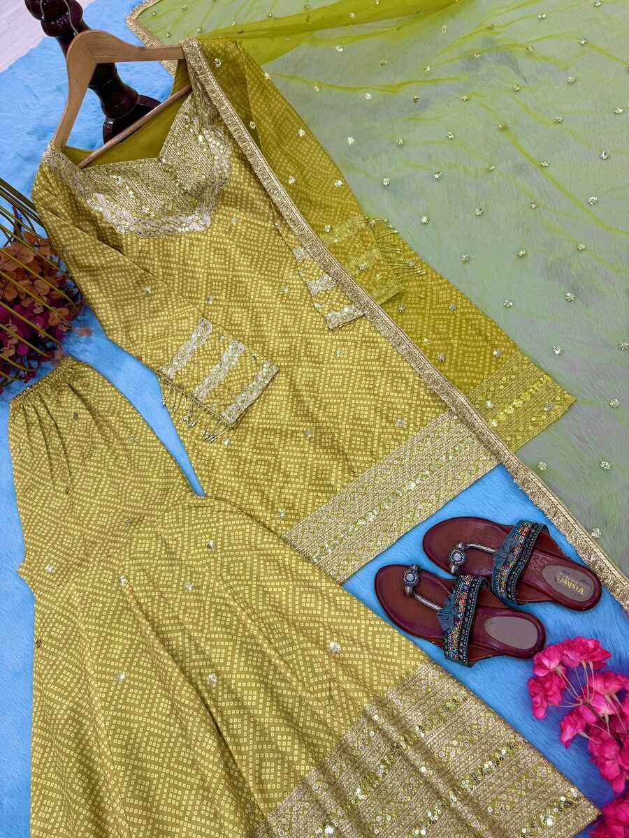 DESIGNER CHINON SILK DIGITAL PRINT WITH EMBROIDERY SEQUENCE WORK TOP BLOUSE SHARARA WITH DUPATTA LEMON