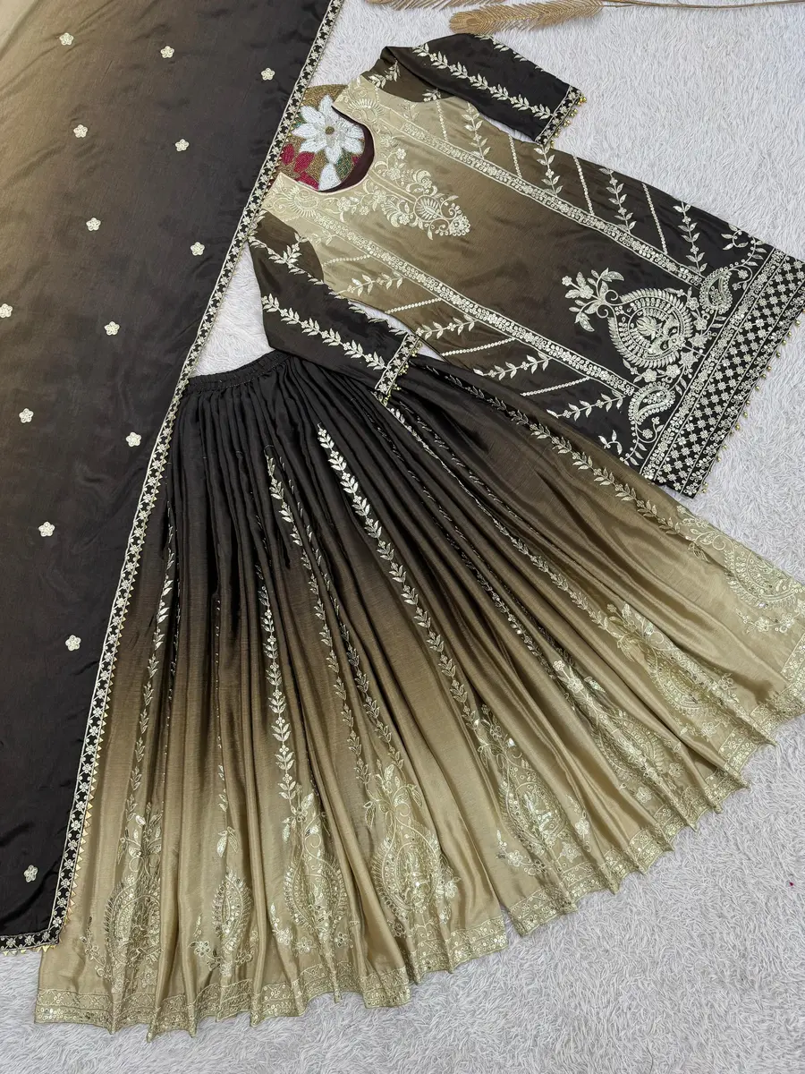 DESIGNER CHINON SILK EMBROIDERY AND SEQUENCE WORK AND HANGINGS LACE BORDER WORK TOP PALAZZO WITH DUPATTA CREAM AND BROWN