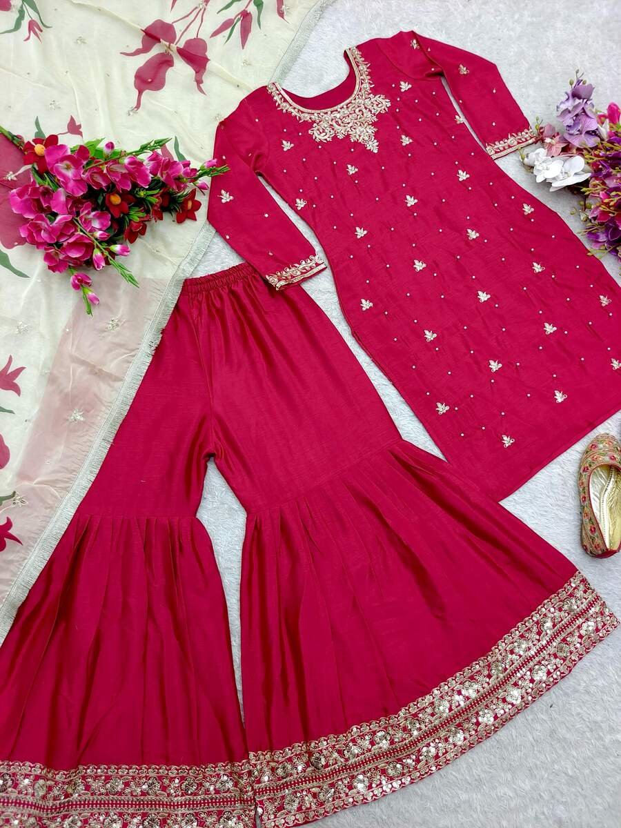 DESIGNER CHINON SILK EMBROIDERY SEQUENCE WITH MOTI WORK TOP SHARARA WITH DUPATTA RED