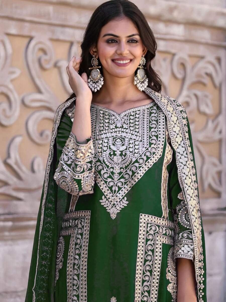 DESIGNER CHINON SILK EMBROIDERY SEQUENCE WORK TOP PALAZZO WITH DUPATTA GREEN