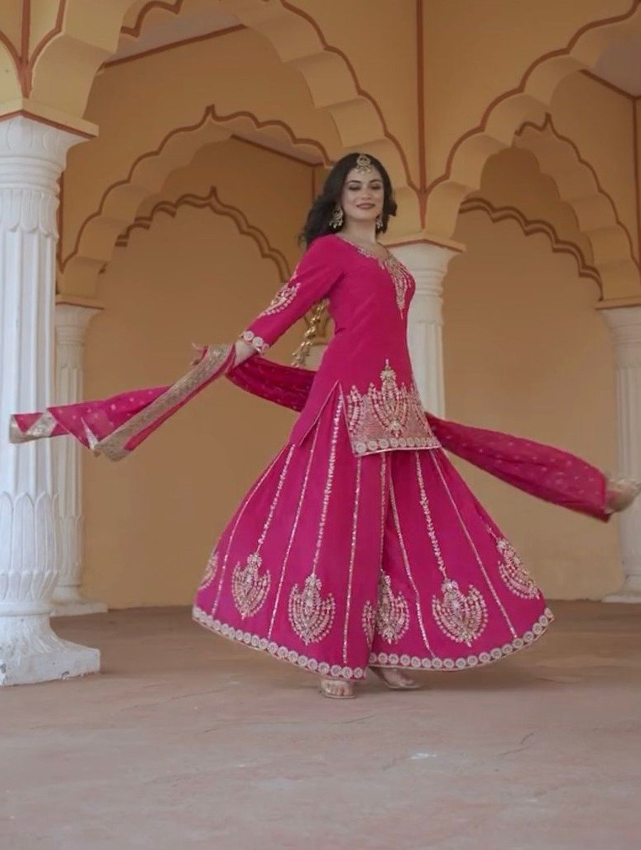 DESIGNER CHINON SILK EMBROIDERY SEQUENCE WORK TOP PALAZZO WITH DUPATTA PINK