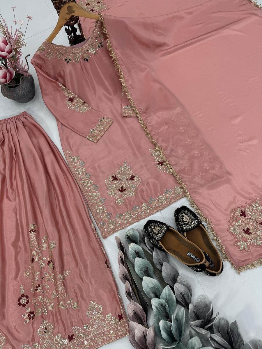 DESIGNER CHINON SILK EMBROIDERY SEQUENCE WORK WITH PERAL AND REAL MIRROR HAND WORK TOP PALAZZO WITH DUPATTA PEACH