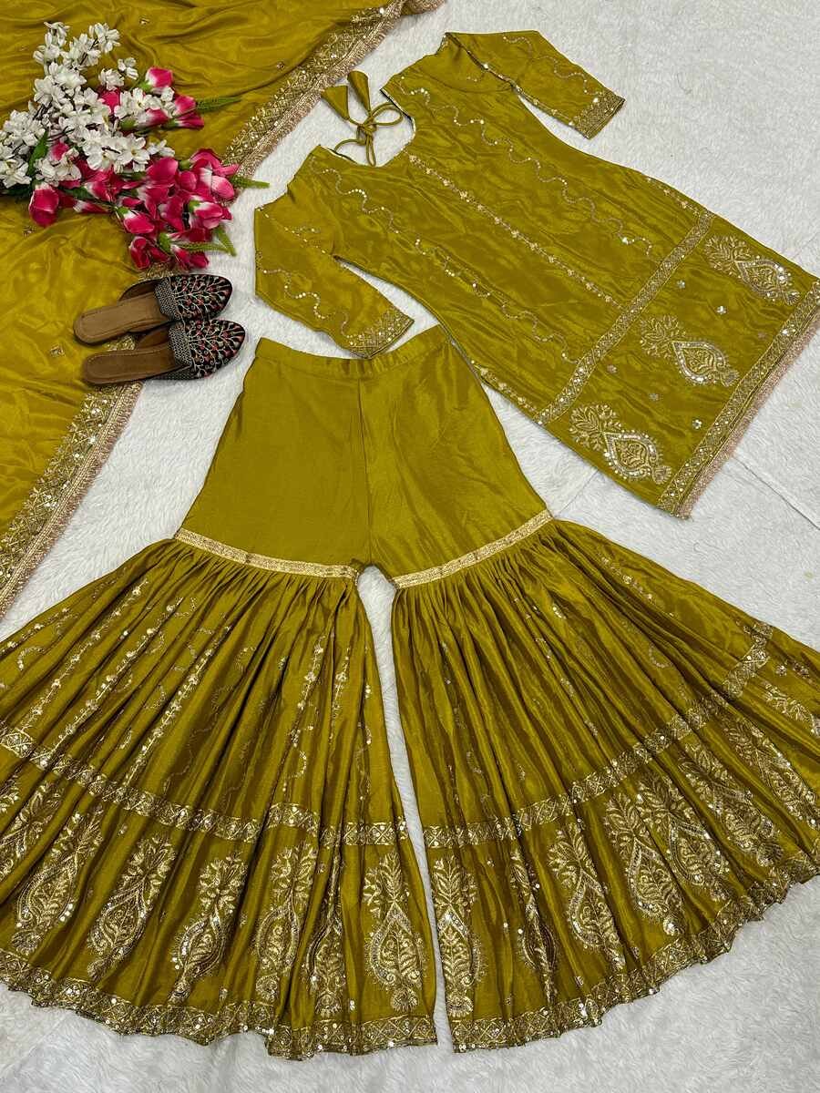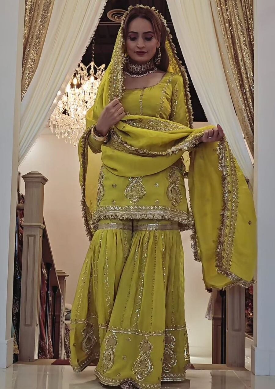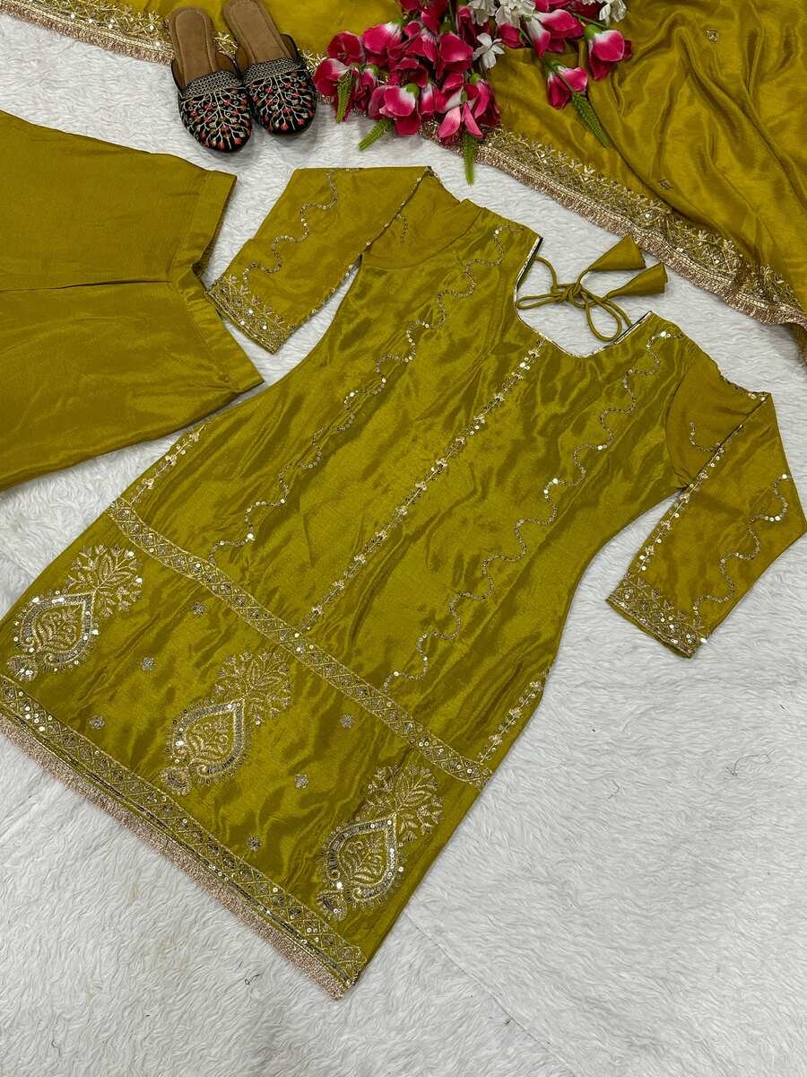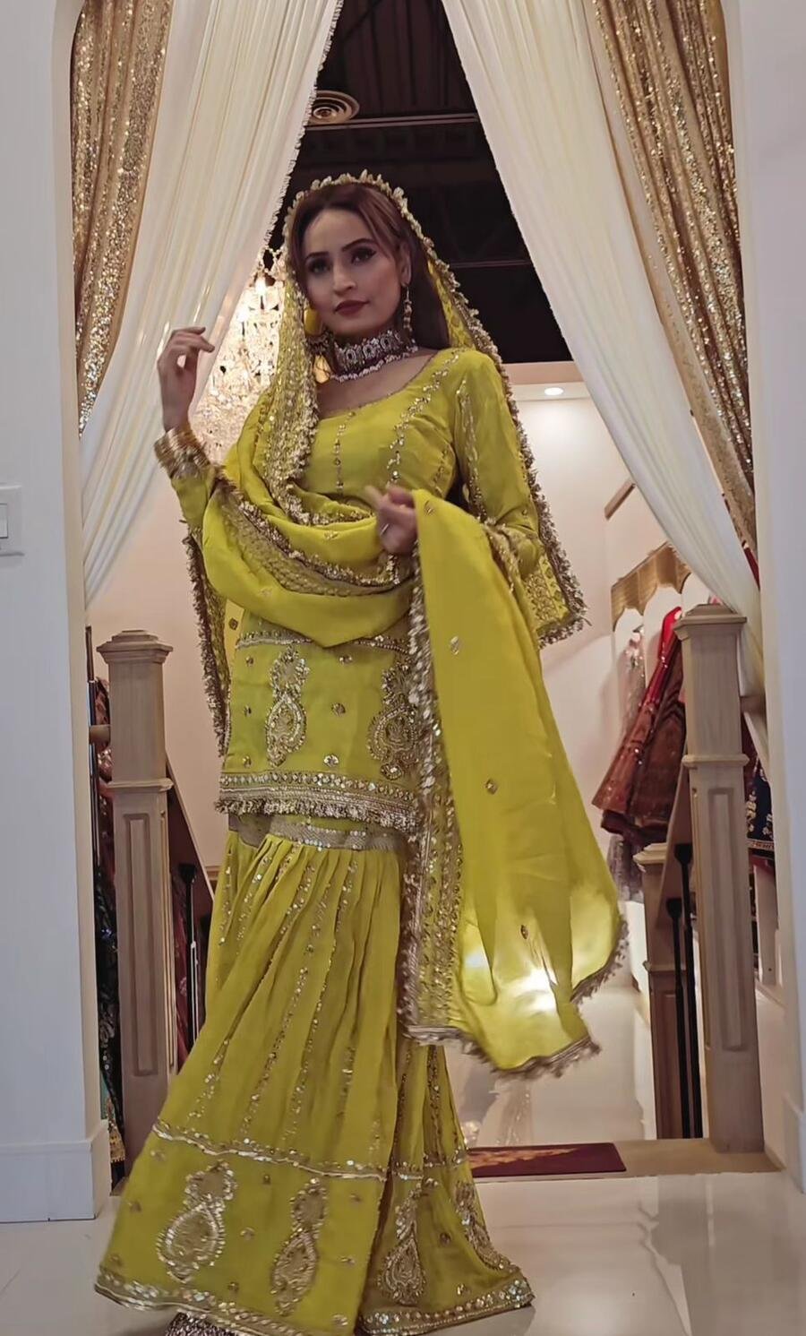 DESIGNER CHINON SILK EMBROIDERY WORK WITH FANCY LACE BORDER WORK TOP SHARARA WITH DUPATTA PARROT GREEN