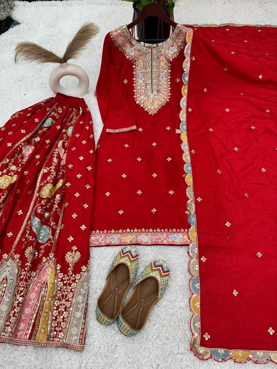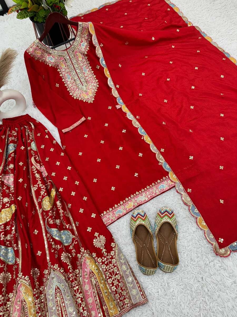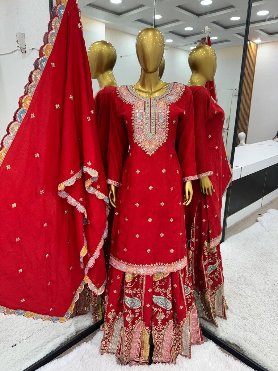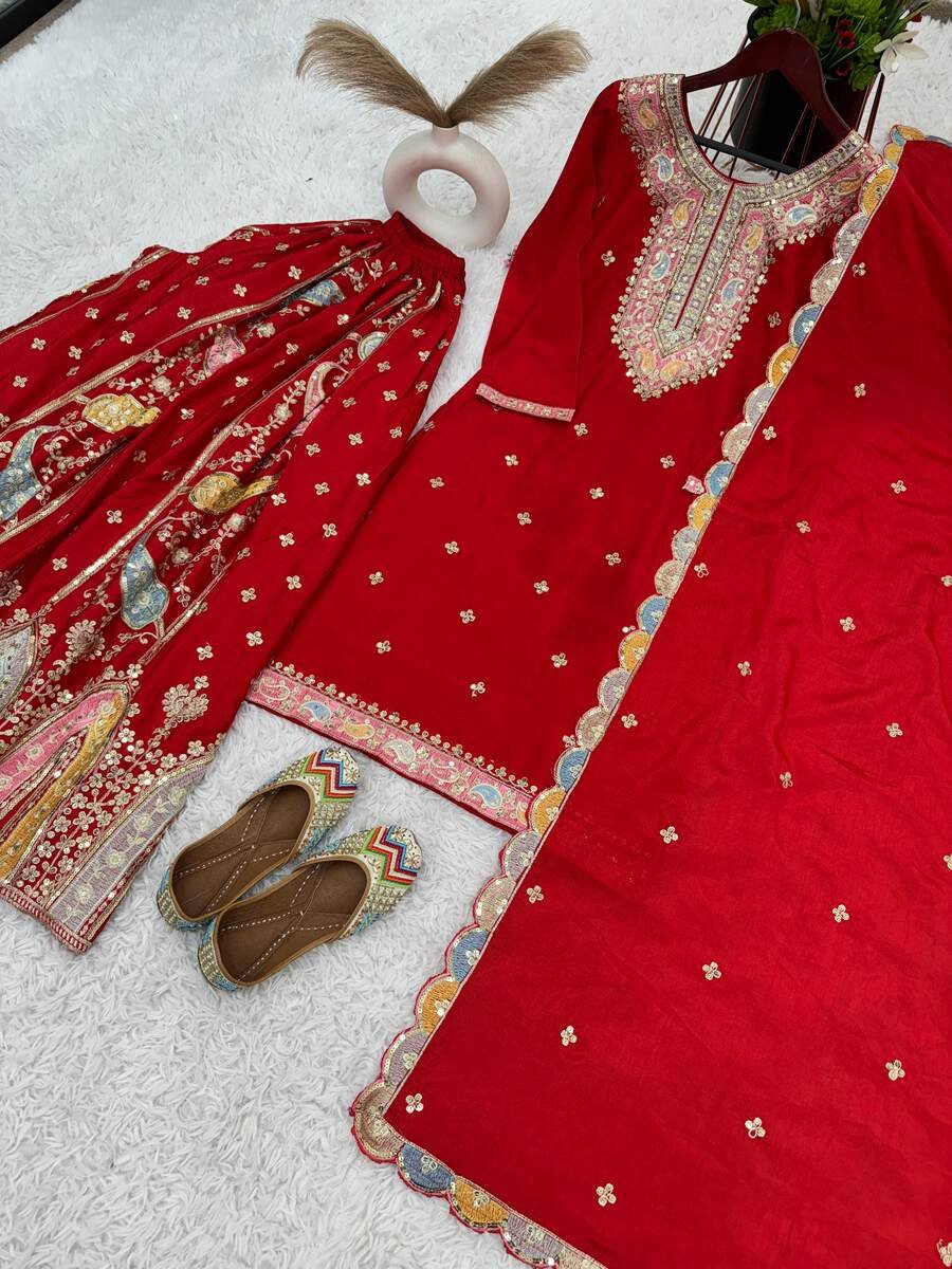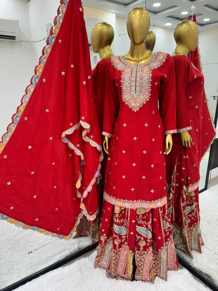 DESIGNER CHINON THREAD EMBROIDERY SEQUENCE WORK TOP PALAZZO WITH DUPATTA RED