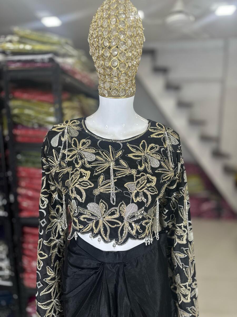 DESIGNER CHINON THREAD, EMBROIDERY ZARI AND SEQUENCE WORK CROP TOP WITH DRAPE SKIRT BLACK