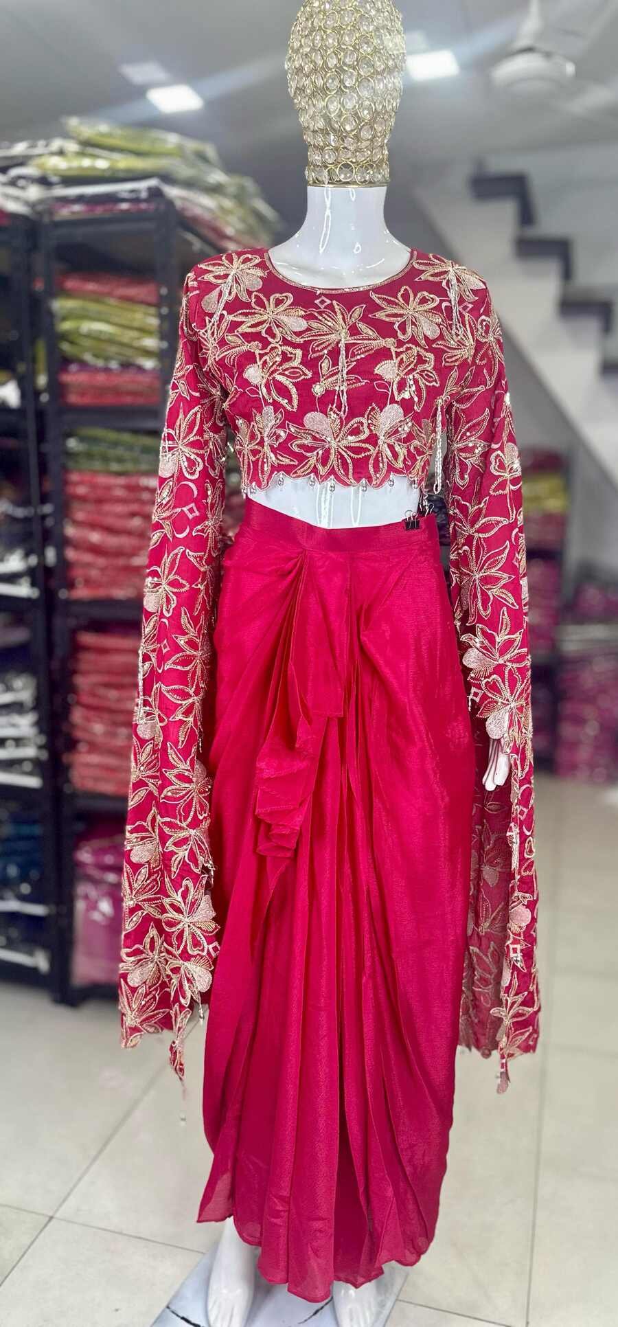 DESIGNER CHINON THREAD, EMBROIDERY ZARI AND SEQUENCE WORK CROP TOP WITH DRAPE SKIRT RANI