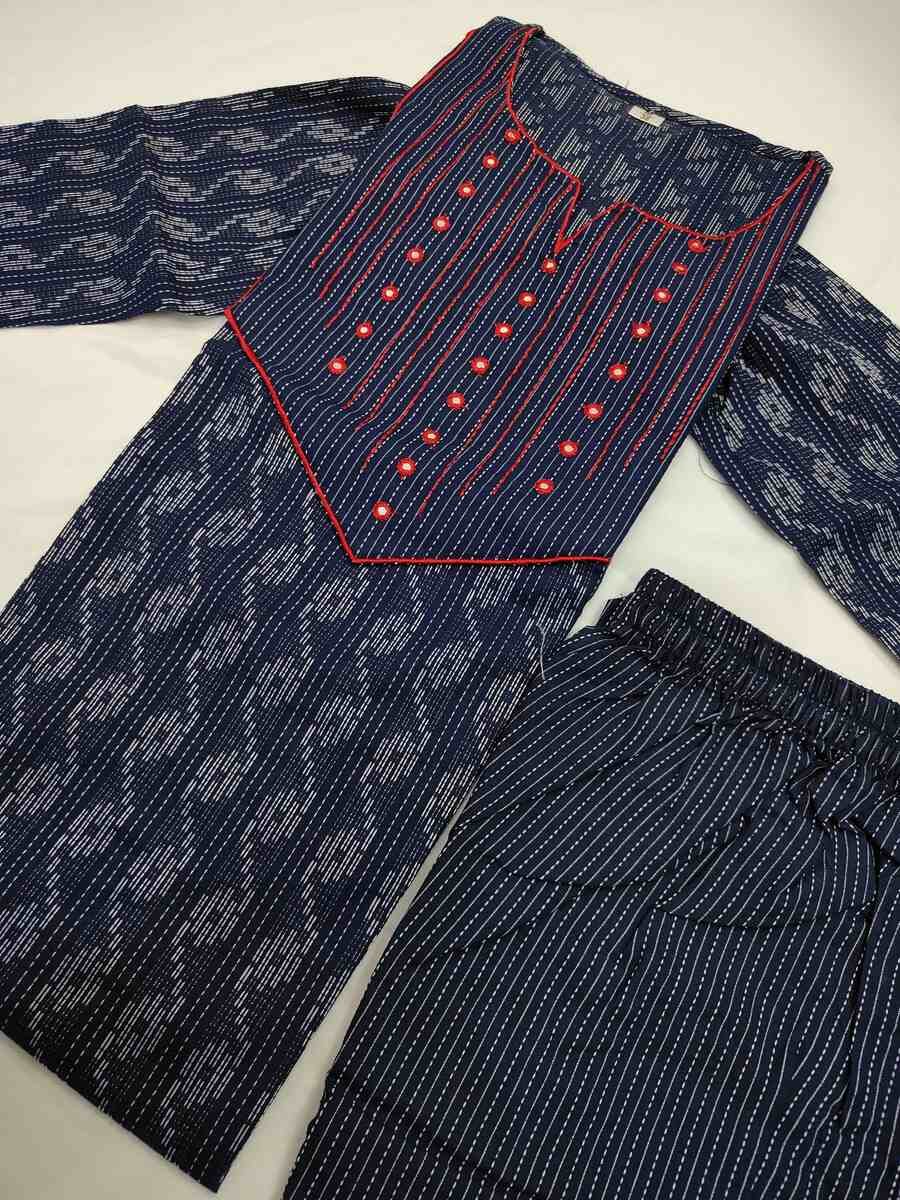 DESIGNER COTTON KATHA EMBROIDERY WORK TOP PENT SET NAVY BLUE