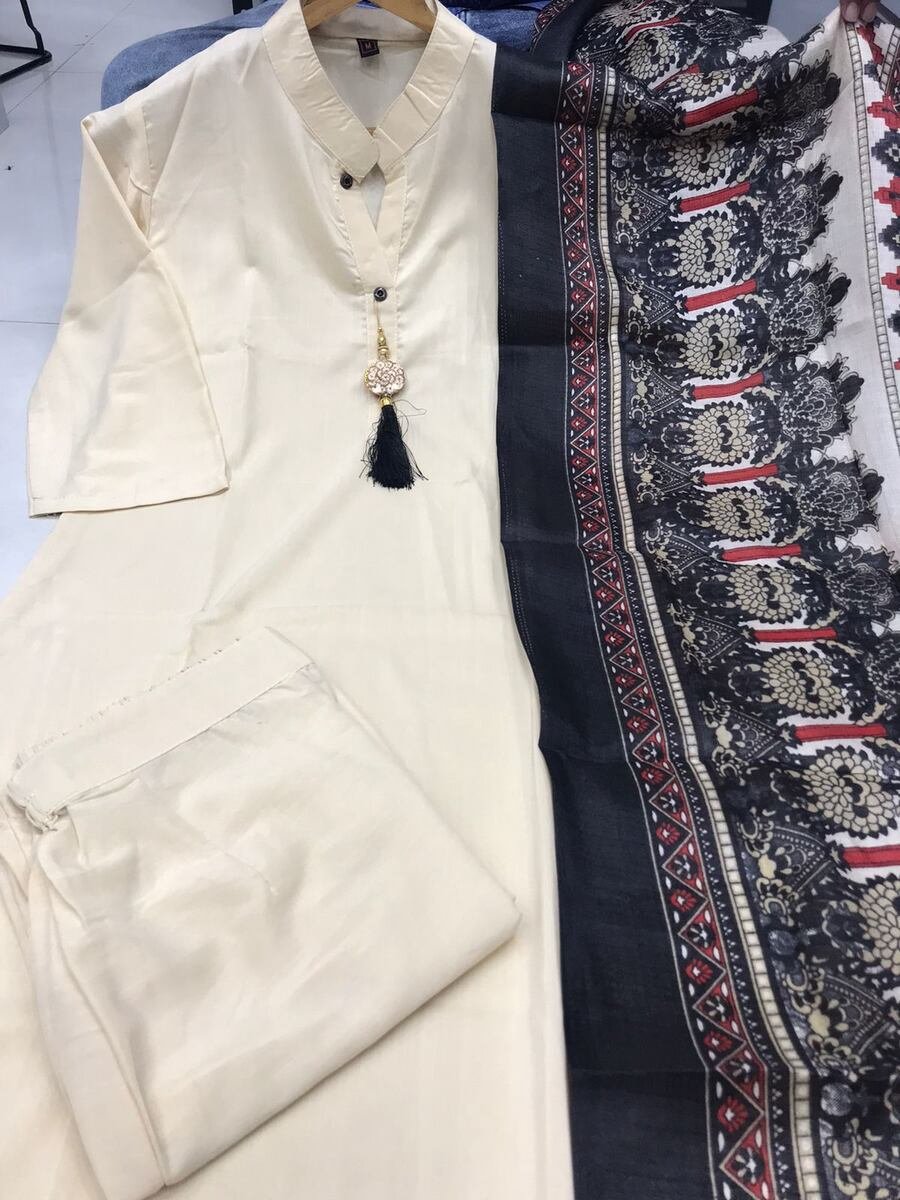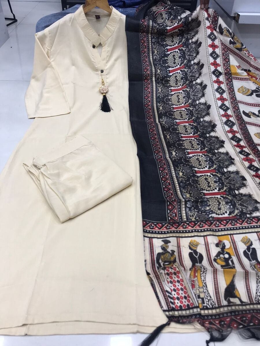 DESIGNER COTTON KHADI PRINT AND ZALAR WORK TOP BOTTOM WITH DUPATTA WHITE