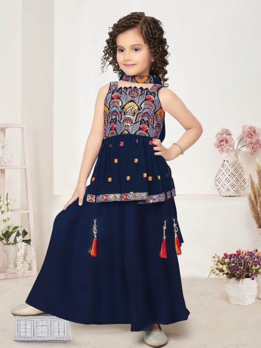 DESIGNER CREEP EMBROIDERY WORK KID’S TOP PALAZZO WITH DUPATTA NAVY BLUE