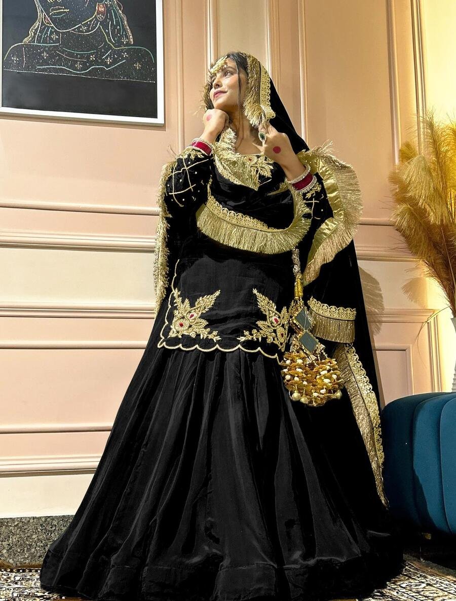 DESIGNER CREEP SILK BEADS HAND WORK WITH SEQUENCE MULTI NEEDLE EMBROIDERY AND ZARI WORK TOP LEHENGA WITH DUPATTA BLACK