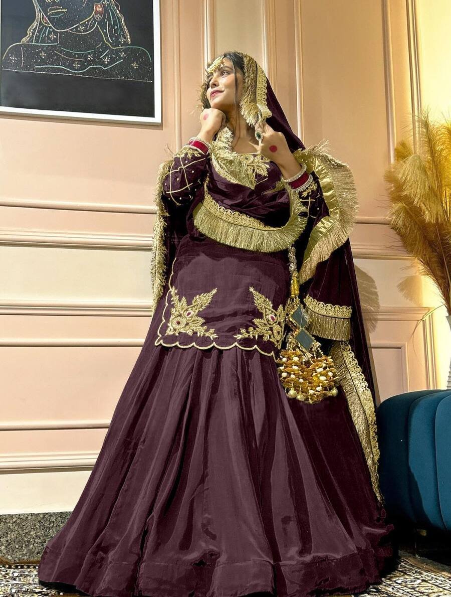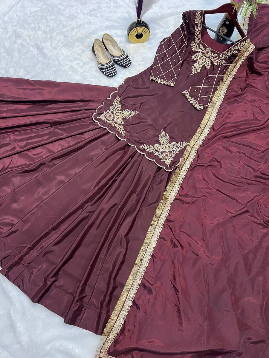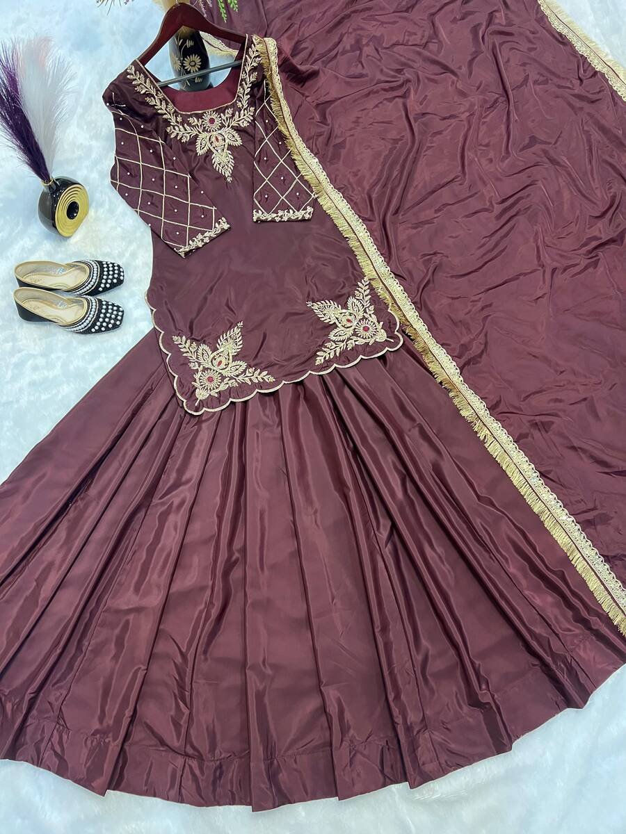 DESIGNER CREEP SILK BEADS HAND WORK WITH SEQUENCE MULTI NEEDLE EMBROIDERY AND ZARI WORK TOP LEHENGA WITH DUPATTA BROWN