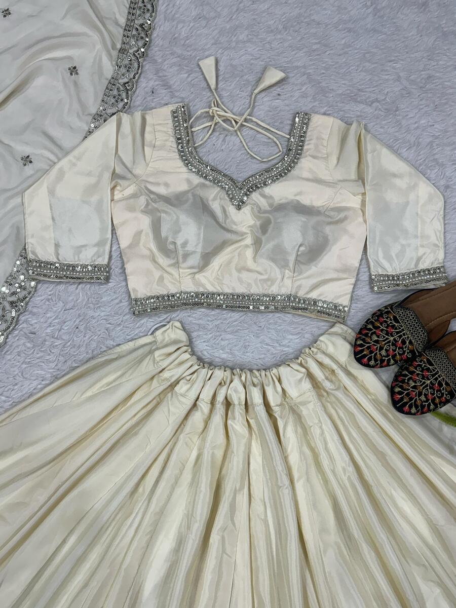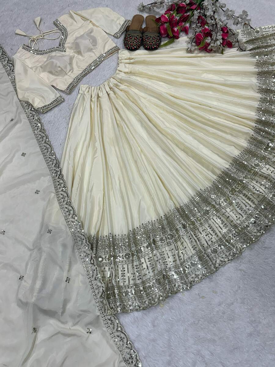 DESIGNER CREEP SILK EMBROIDERY SEQUENCE WORK WITH DIAMOND WORK LEHENGA CHOLI WITH DUPATTA OFF WHITE