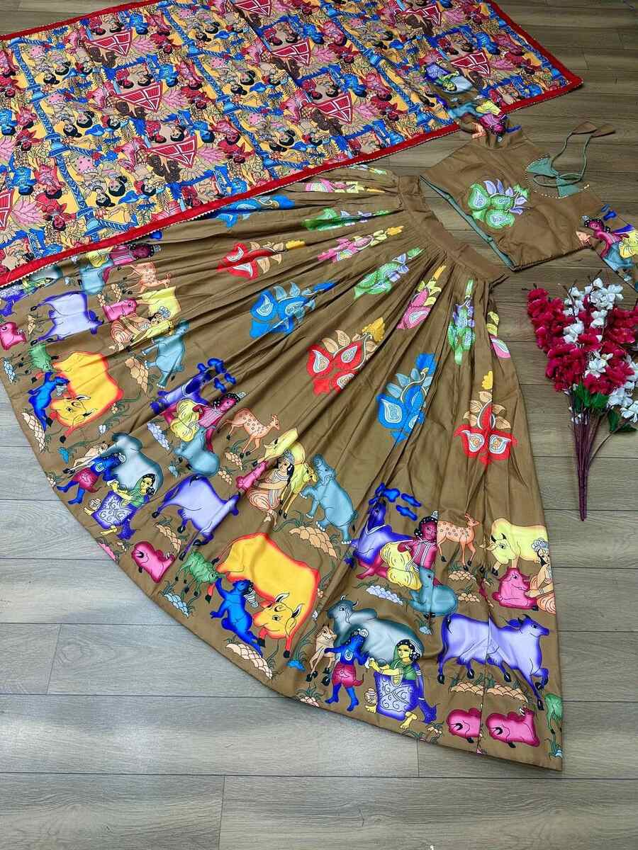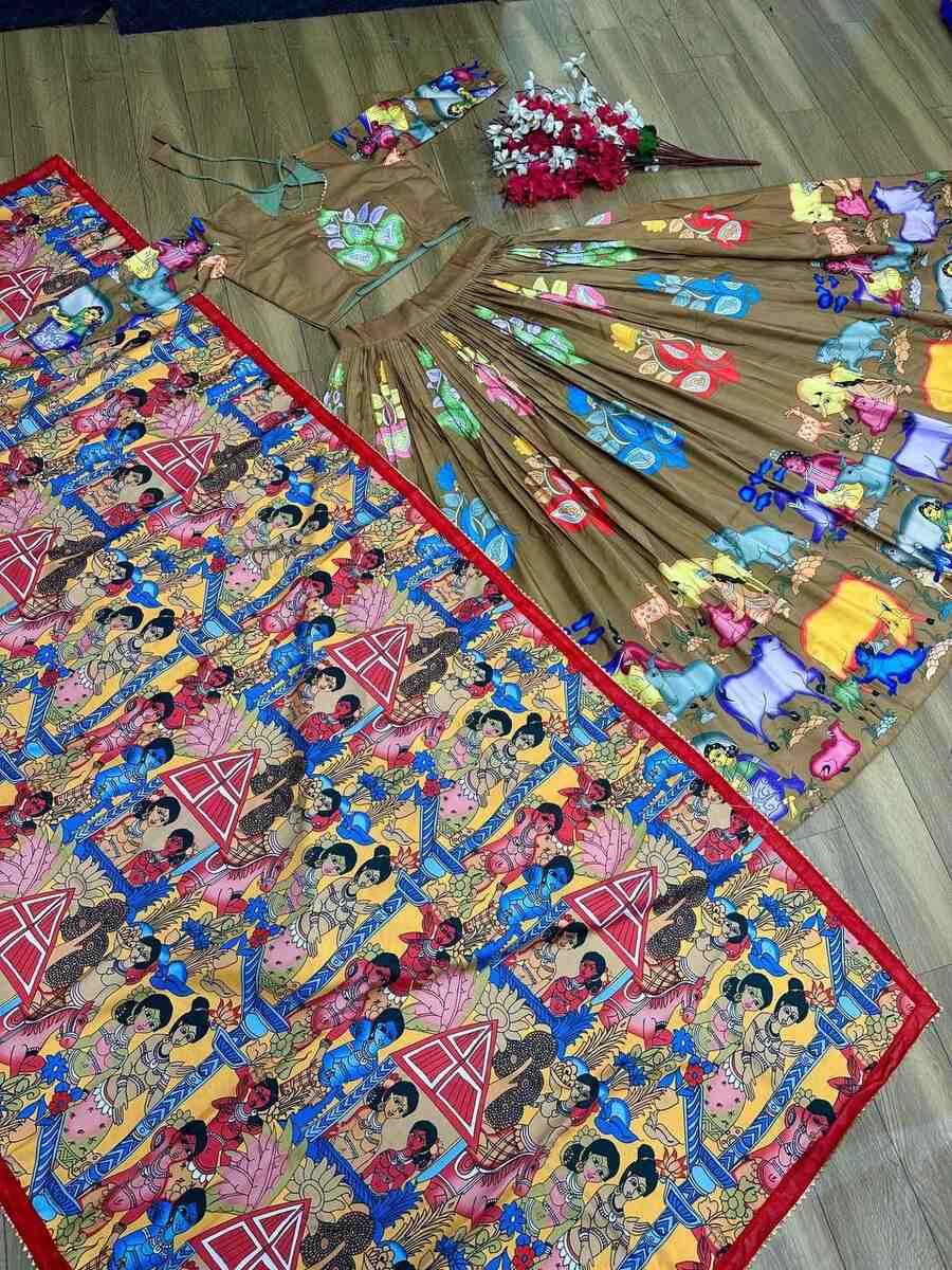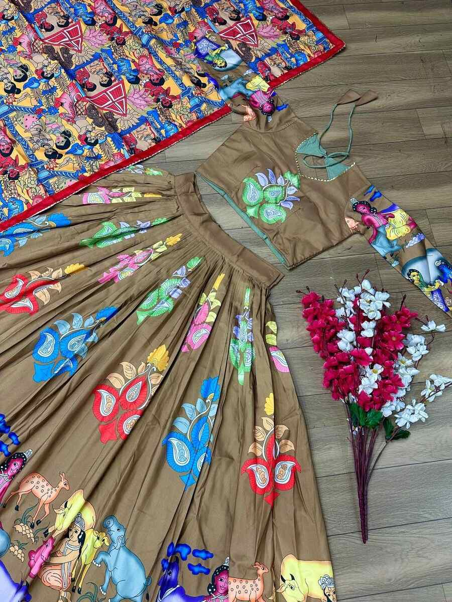 DESIGNER CREPE KALAMKARI PRINT WORK LEHENGA CHOLI WITH DUPATTA MEHNDI