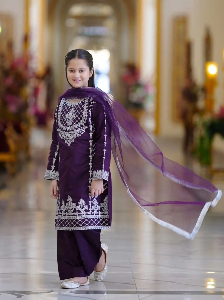 DESIGNER CREPE SILK EMBROIDERY SEQUENCE WORK KID’S TOP BOTTOM WITH DUPATTA PURPLE