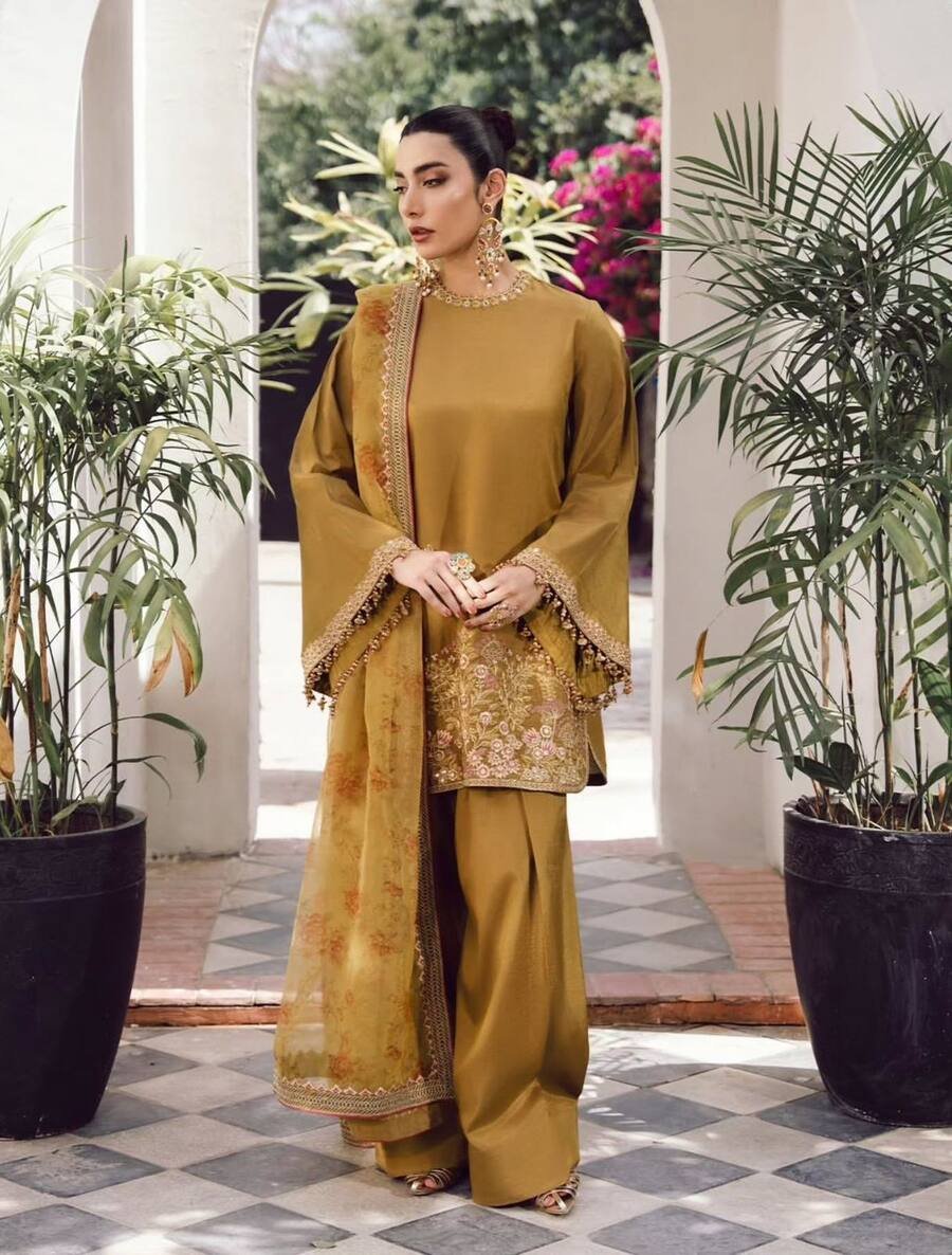 DESIGNER CREPE SILK EMBROIDERY SEQUENCE WORK WITH HEAVY LACE AND MOTI WORK TOP PATIYALA WITH DUPATTA KHAKI