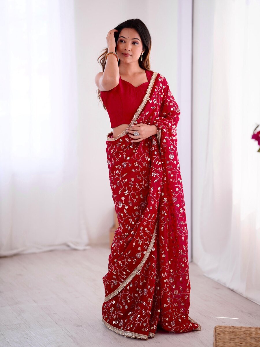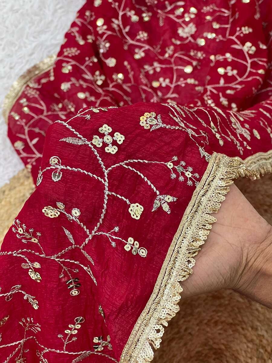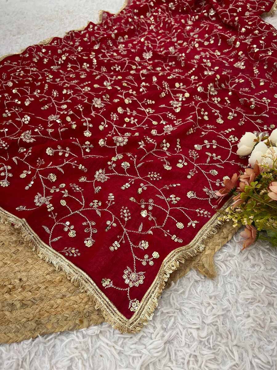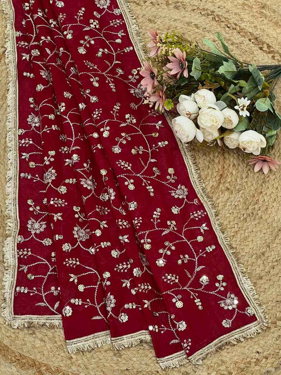 DESIGNER CRUNCHY SILK EMBROIDERY SEQUENCE WORK WITH LACE BORDER WORK SAREE WITH UNSTITCHED BLOUSE RED