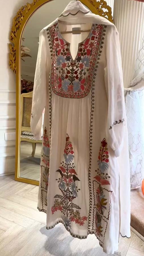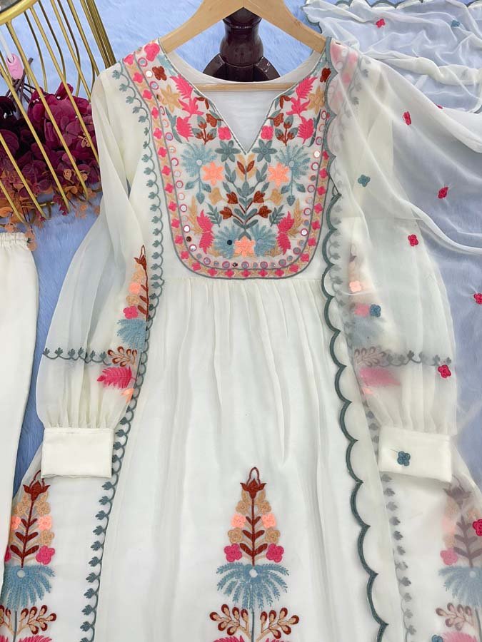 DESIGNER FAUX GEORGETTE MULTI NEEDLE WITH ORIGINAL MIRROR EMBROIDERY WORK TOP BOTTOM WITH DUPATTA WHITE