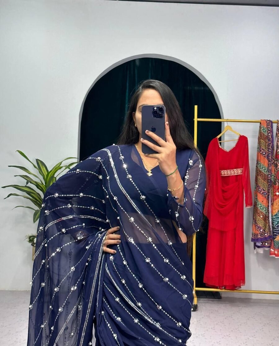 DESIGNER FAUX GEORGETTE EMBROIDERY AND REAL PEARL MOTI WORK LEHENGA SAREE WITH EMBROIDED DUPATTA AND FULL STITCHED BLOUSE NAVY BLUE