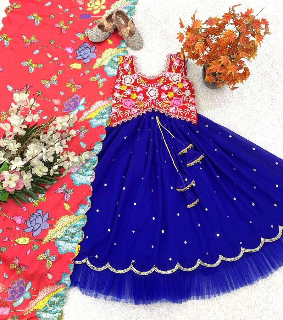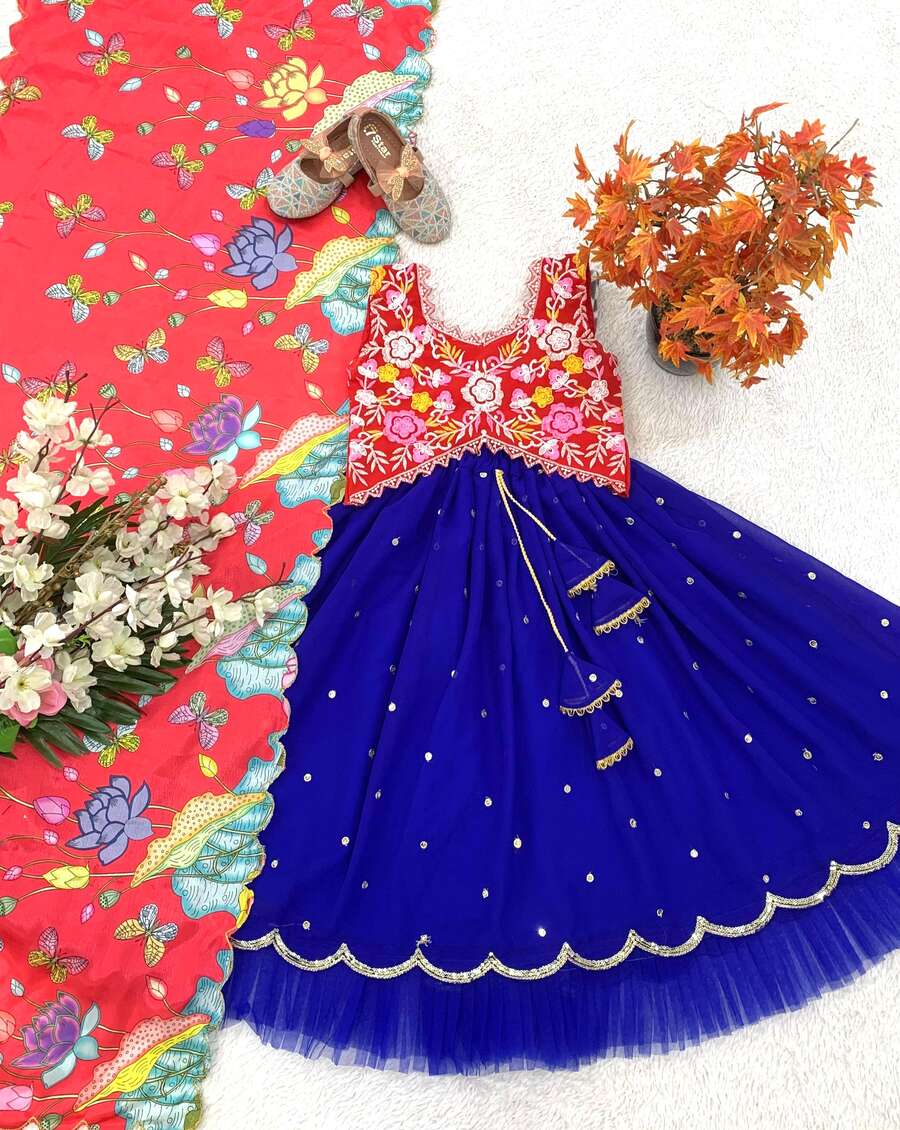 DESIGNER FAUX GEORGETTE EMBROIDERY SEQUENCE WORK KID’S FULL STITCHED LEHENGA BLOUSE WITH DUPATTA BLUE