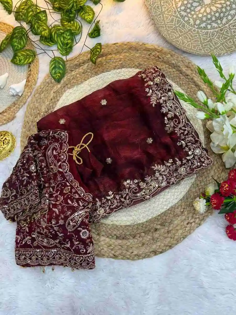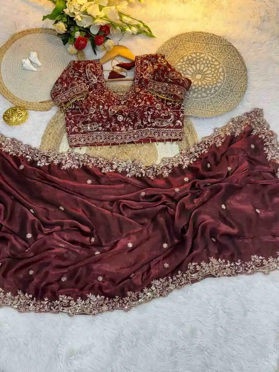 DESIGNER FENDY SATIN EMBROIDERY SEQUENCE WITH BORDER AND BUTTI WORK SAREE WITH STITCHED BLOUSE MAROON