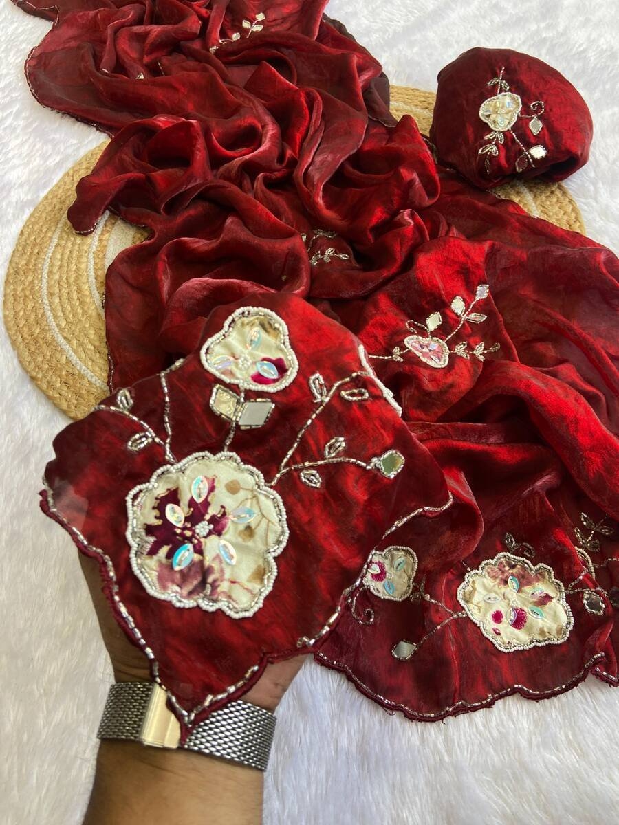 DESIGNER FENDY SATIN HAND WORK AND PATCH WORK SAREE WITH UNSTITCHED BLOUSE BROWN