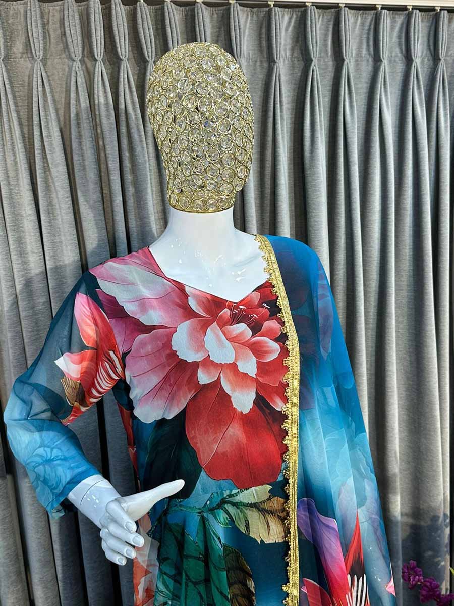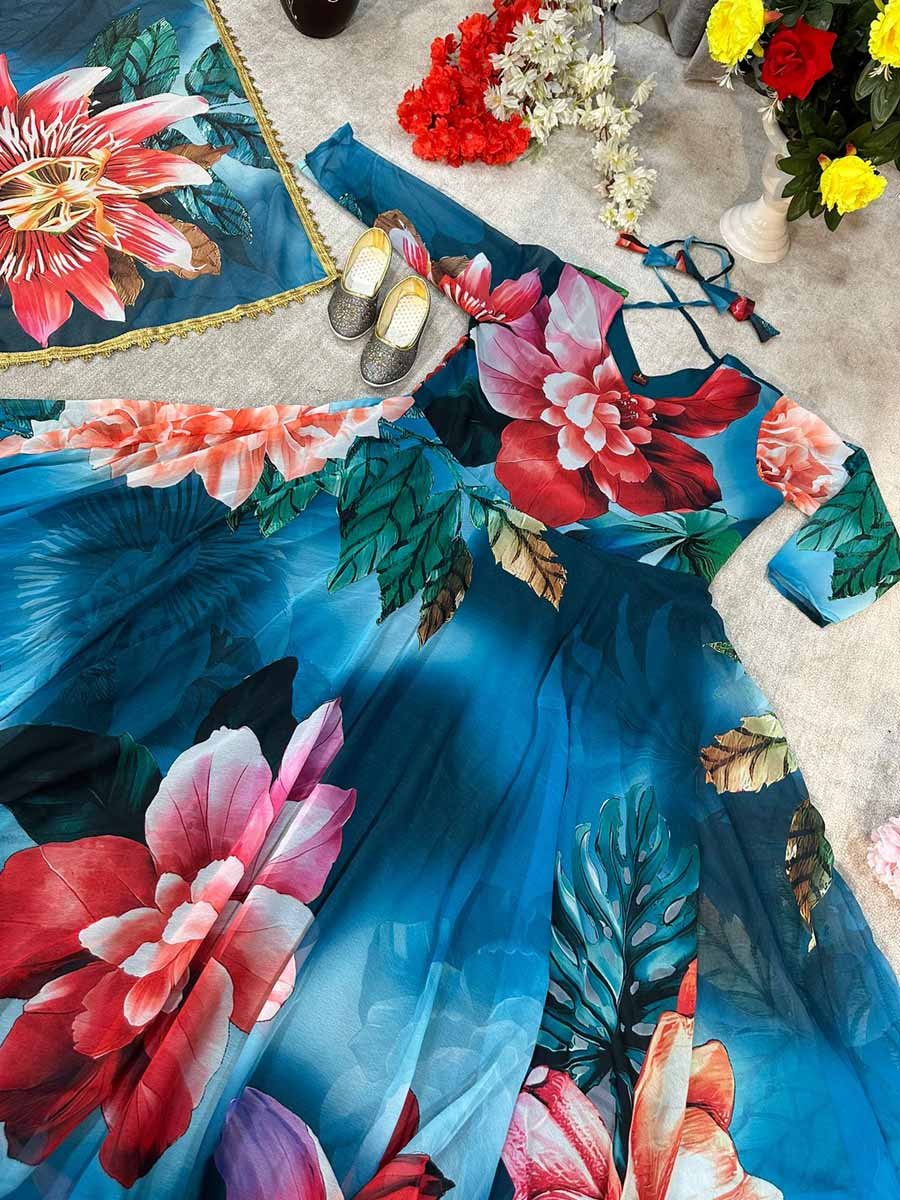 GOWN FABRIC: FAUX GEORGETTE WITH FLORAL DESIGN PRINT DESIGN AND WIRE PIPING