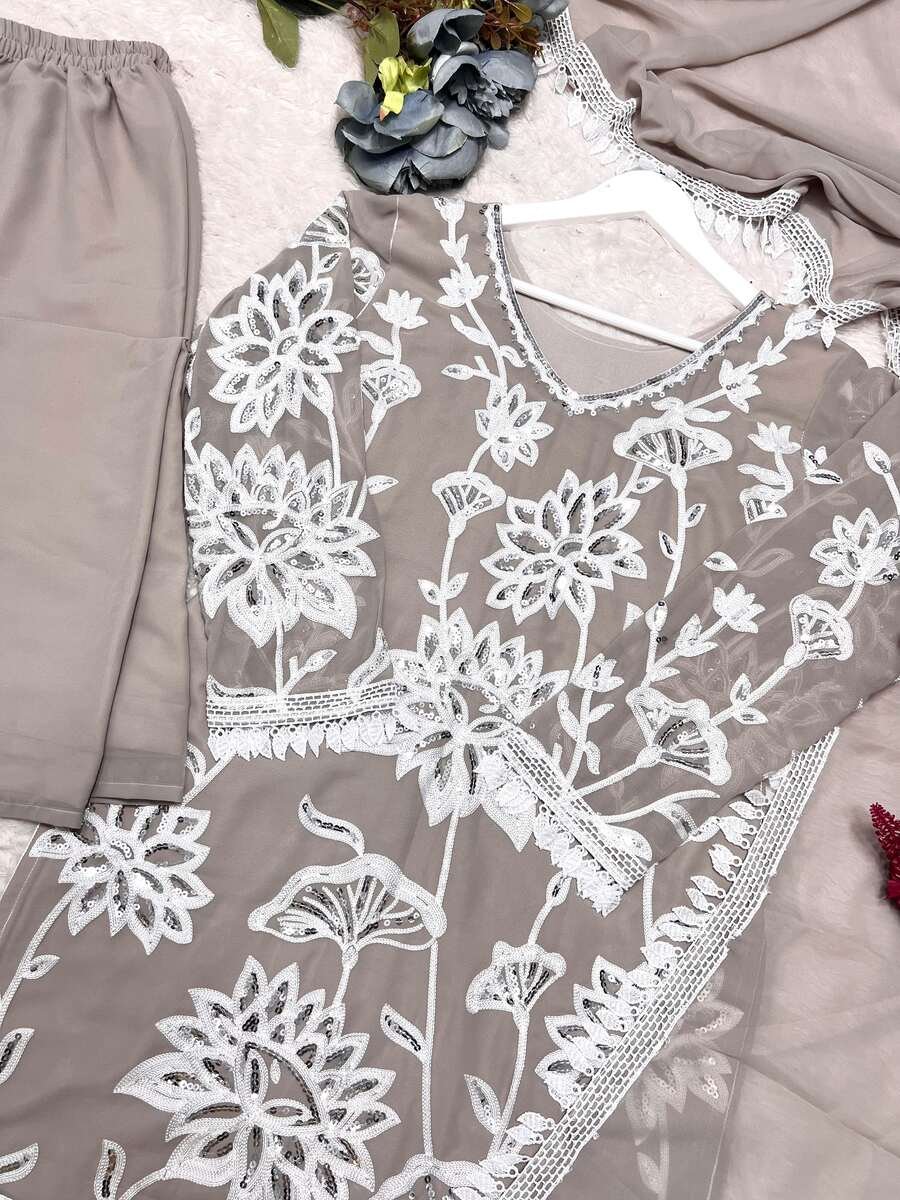 DESIGNER GEORGETTE BEAUTIFUL CHAIN STITCH EMBROIDERY SEQUENCE WITH GPO LACE WORK TOP PALAZZO WITH DUPATTA GREY