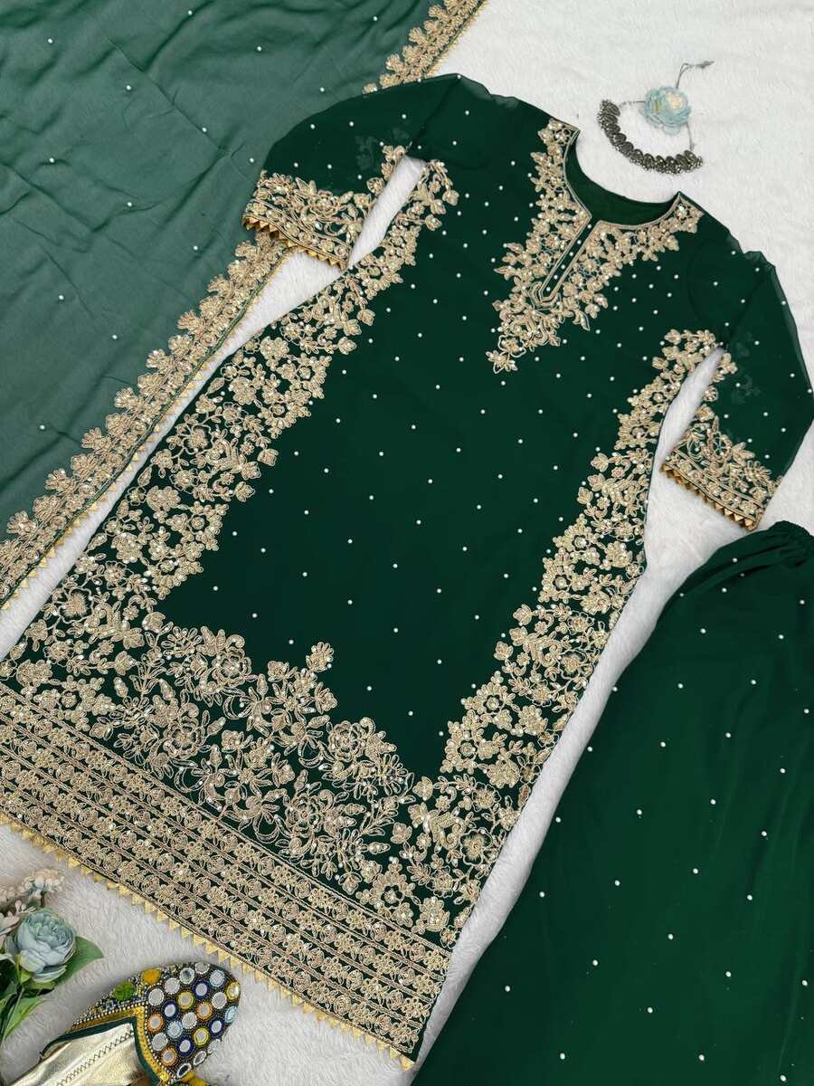 DESIGNER GEORGETTE CODING AND SEQUENCE WITH RIVET MOTI WORK TOP PALAZZO WITH DUPATTA GREEN