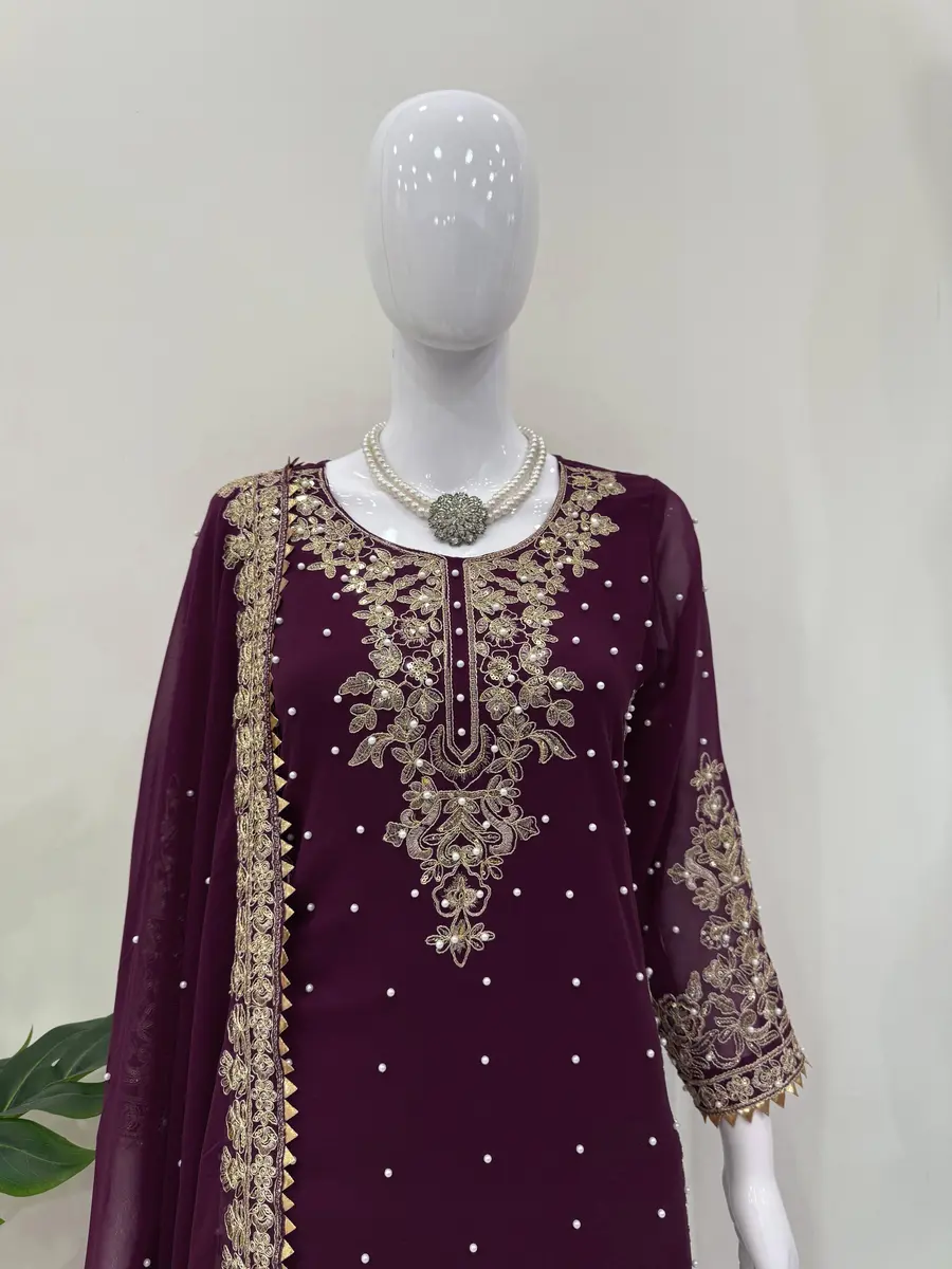 DESIGNER GEORGETTE CODING AND SEQUENCE WITH RIVET MOTI WORK TOP PALAZZO WITH DUPATTA WINE