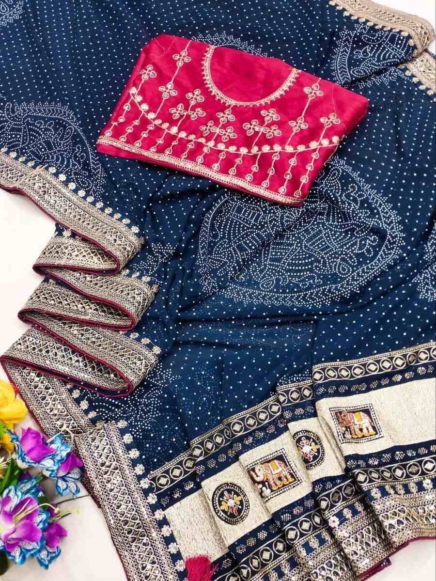 DESIGNER GEORGETTE CODING SEQUENCE BORDER WITH BADHANI FOIL PRINT WORK SAREE WITH UNSITCHED BLOUSE NAVY BLUE