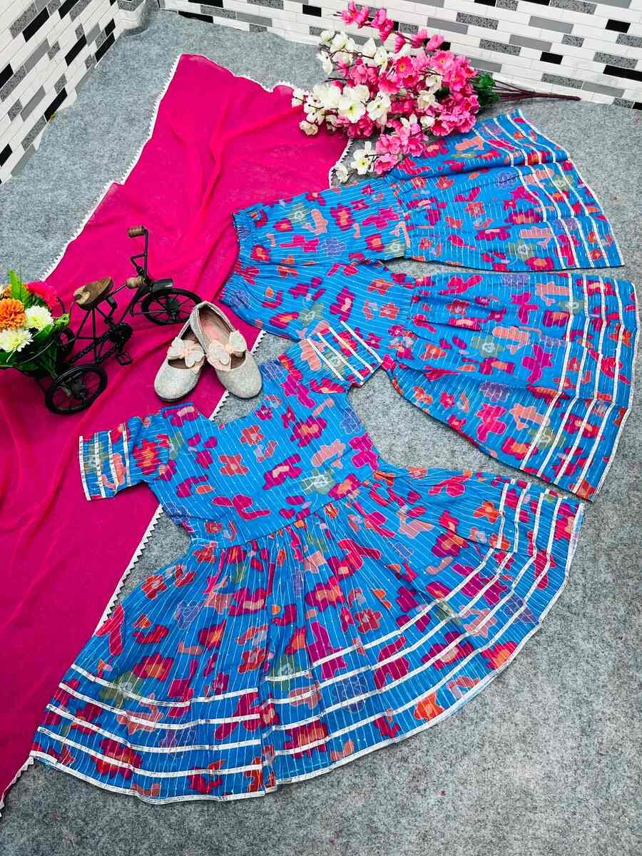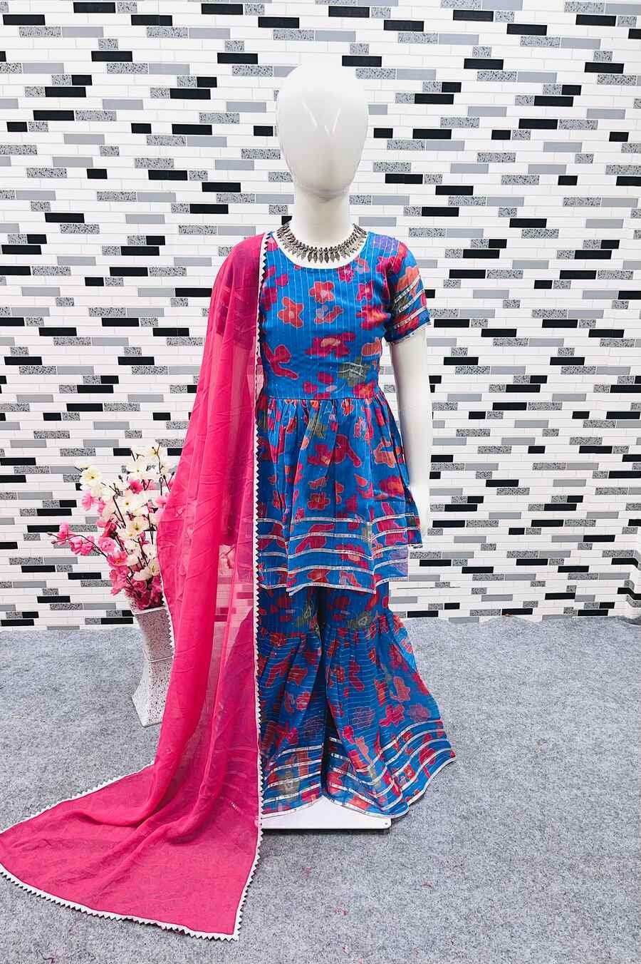 DESIGNER GEORGETTE CROCHET EMBROIDERY WORK KIDS TOP SHARARA WITH DUPATTA BLUE
