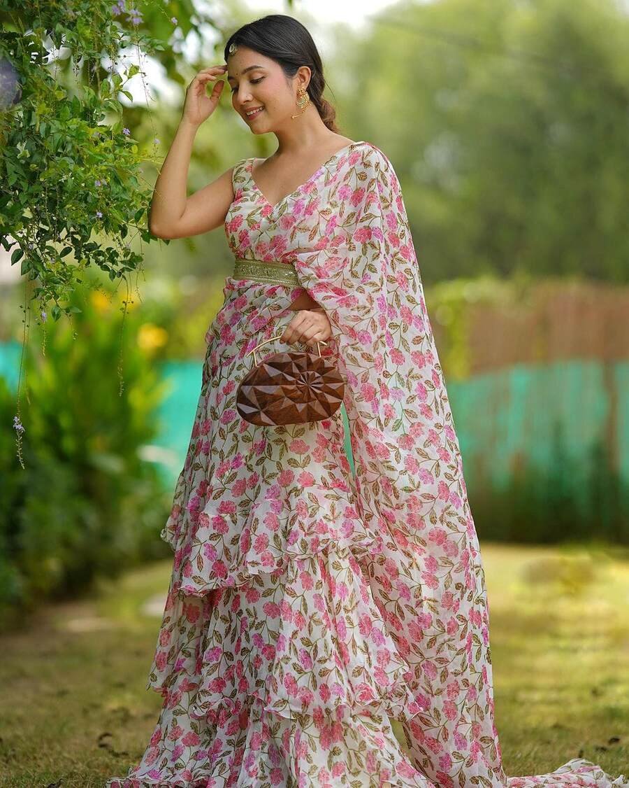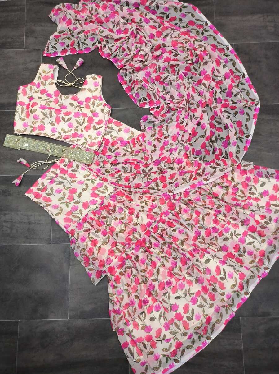 DESIGNER GEORGETTE DIGITAL PRINT AND RUFFLE WORK LEHENGA SAREE BLOUSE WITH BELT BABY PINK