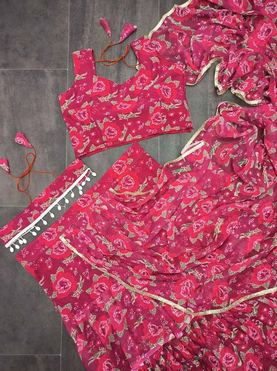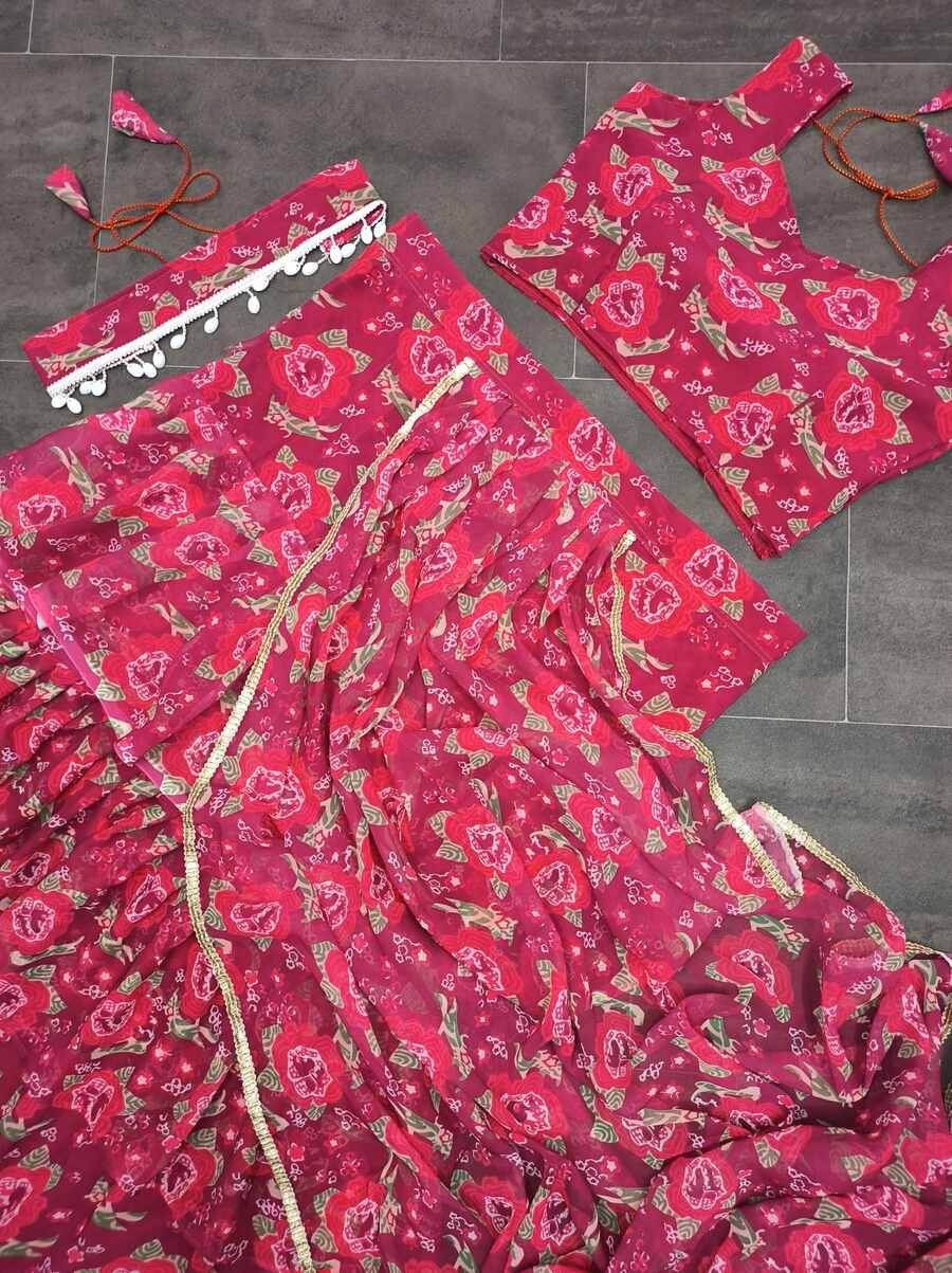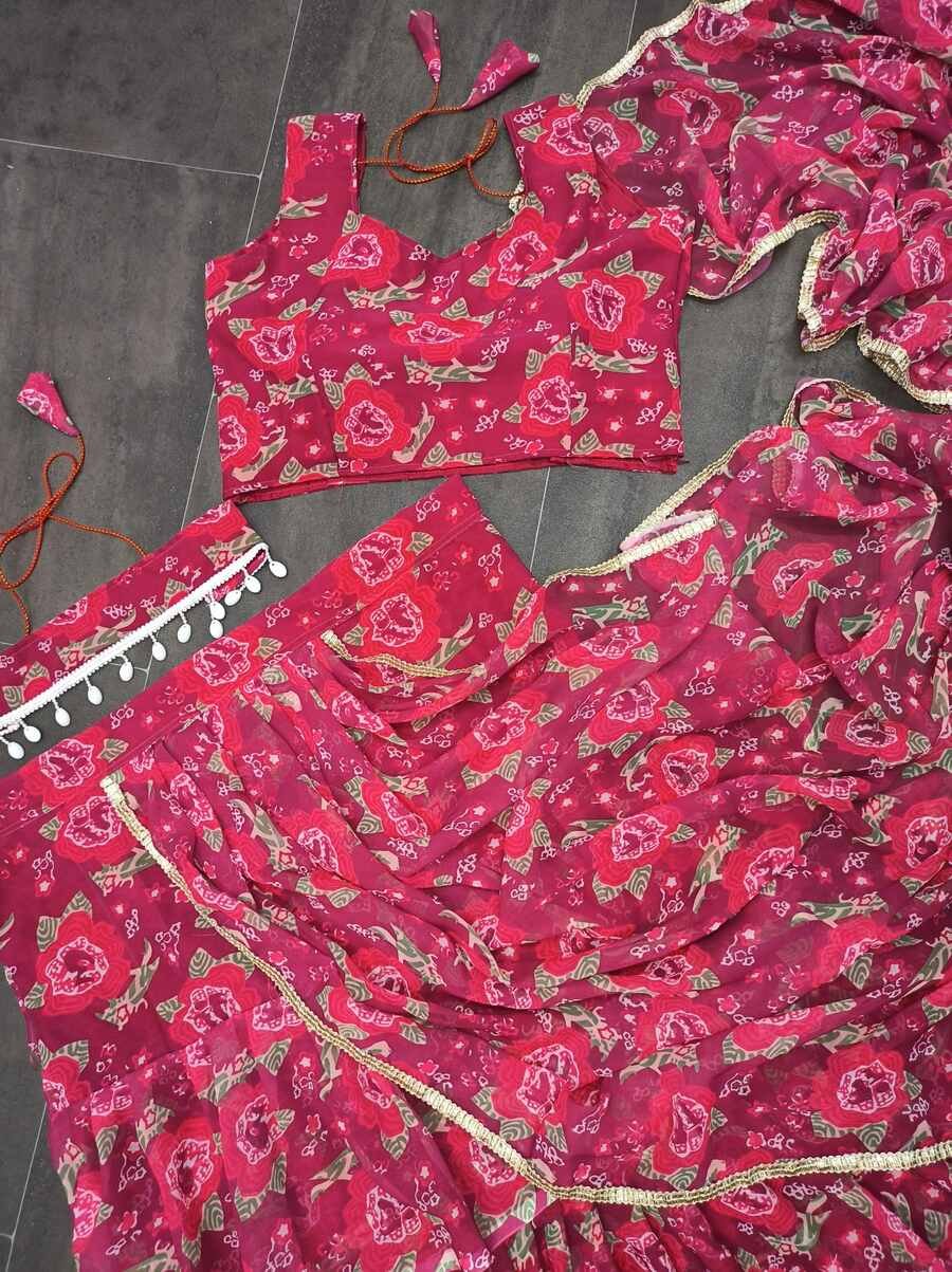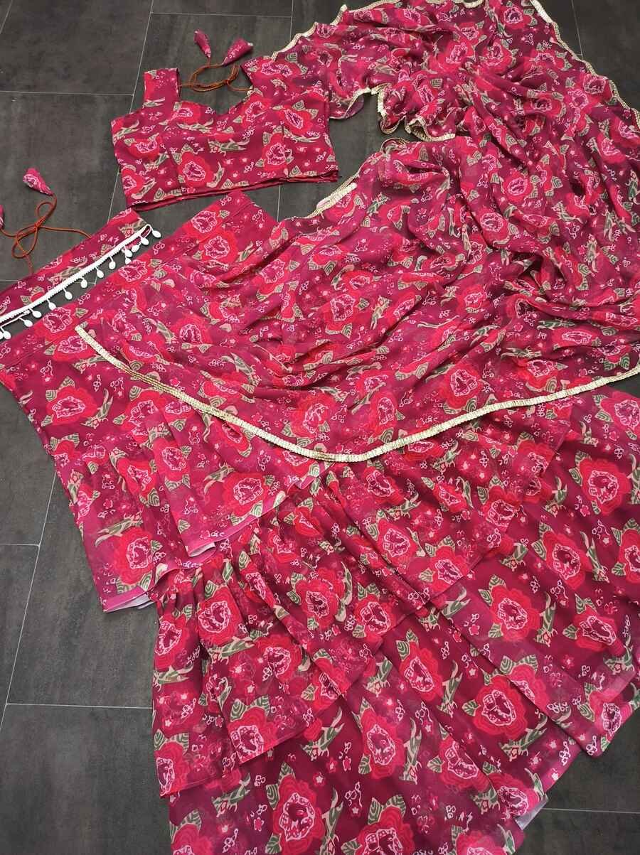 LEHENGA SAREE :- FAUX GEORGETTE WITH DIGITAL PRINT WITH 3 LAYER RUFFLE WITH ATTACHED DUPATTA