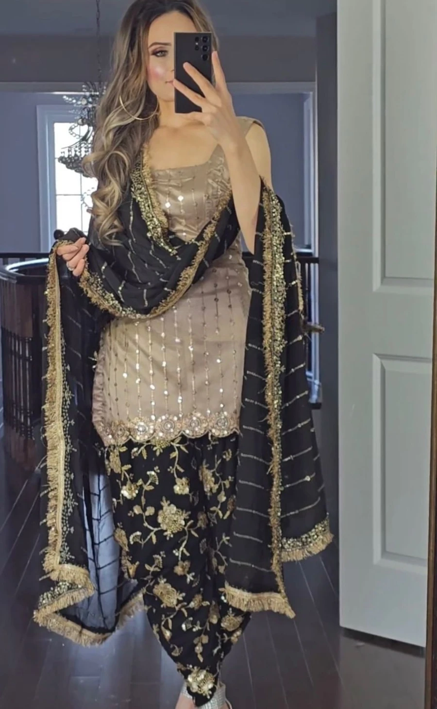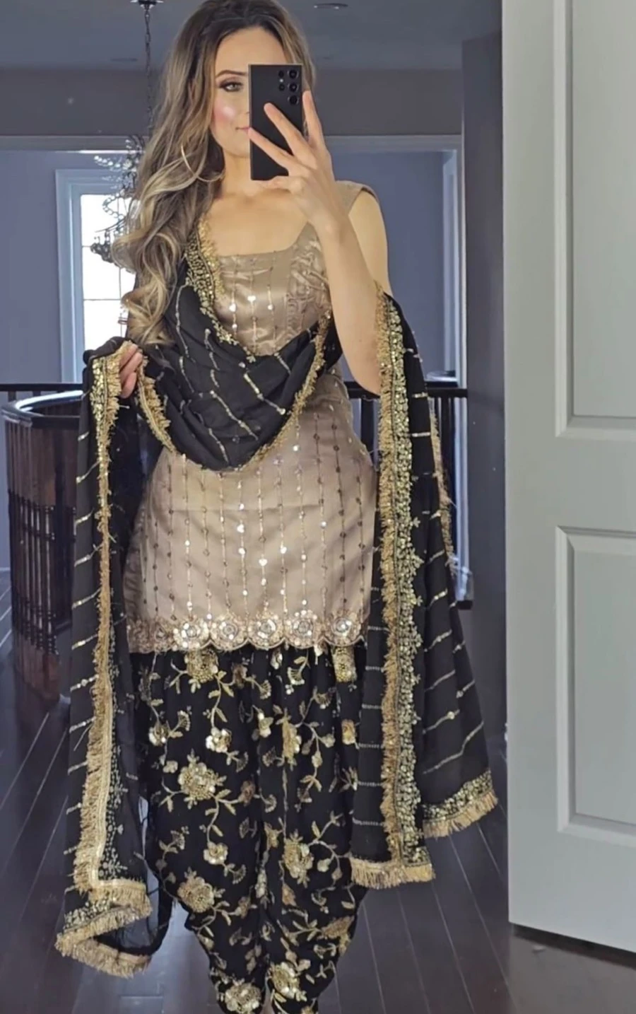 DESIGNER GEORGETTE EMBROIDERY 5 MM SEQUENCE WORK TOP DHOTI SALWAR AND DUPATTA CREAM AND BLACK