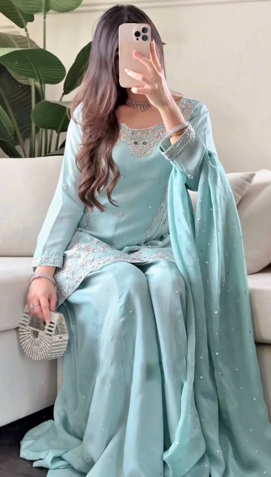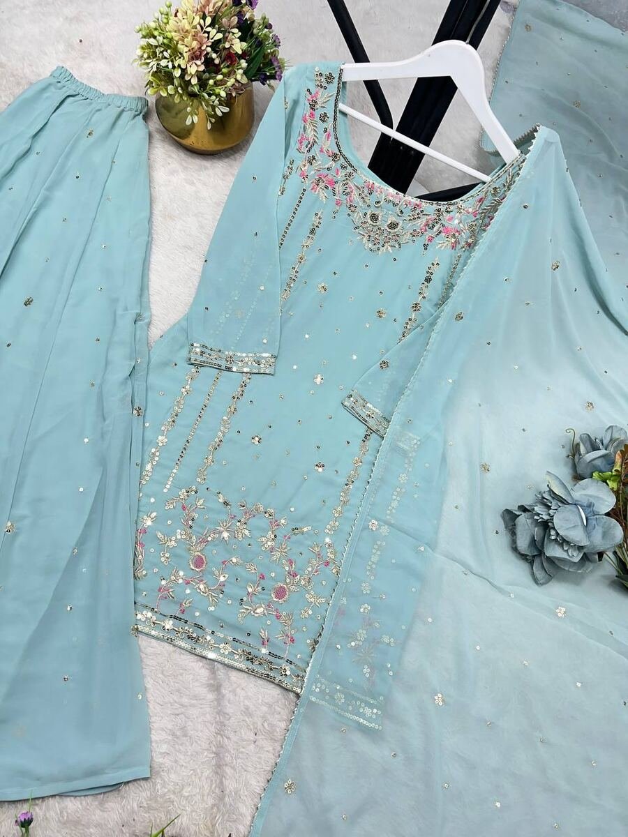 DESIGNER GEORGETTE EMBROIDERY SEQUENCE AND THREAD WORK TOP PALAZZO WITH DUPATTA SKY