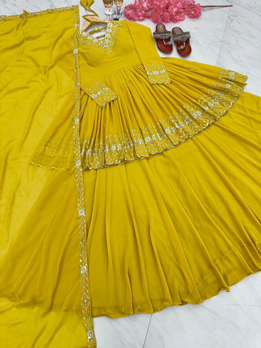 TOP FABRIC : HEAVY FAUX GEORGETTE WITH EMBROIDERY 5 MM SEQUENCE WORK WITH FULL SLEEVE WITH TASSELS
