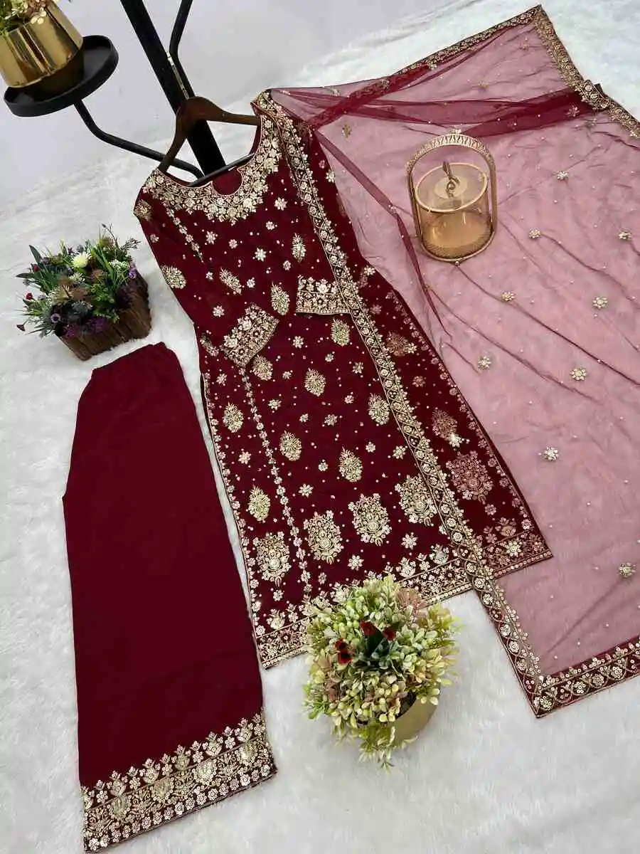 DESIGNER GEORGETTE EMBROIDERY SEQUENCE WORK TOP PALAZZO WITH DUPATTA MAROON