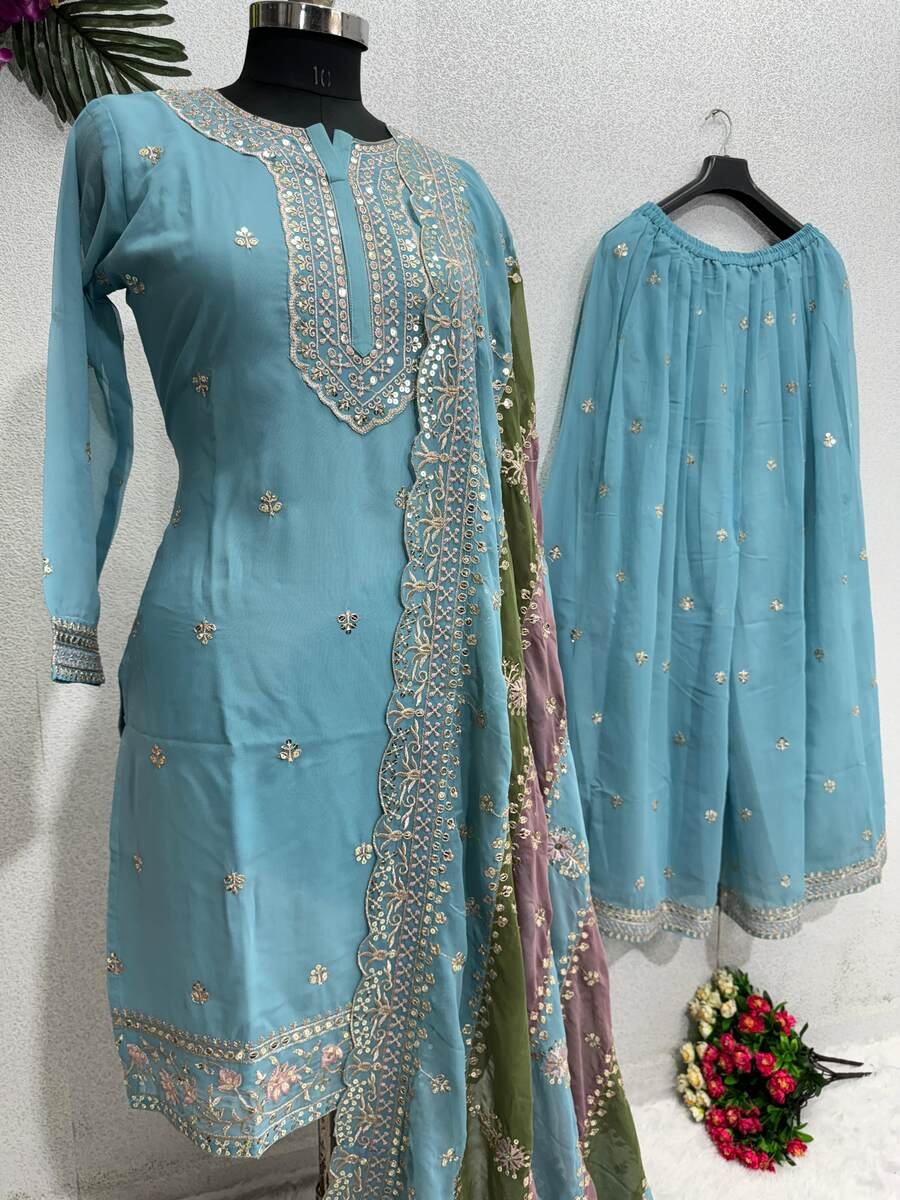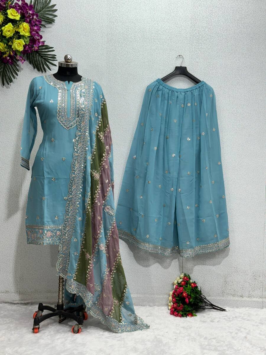 DESIGNER GEORGETTE EMBROIDERY SEQUENCE WORK TOP PALAZZO WITH DUPATTA SEA BLUE