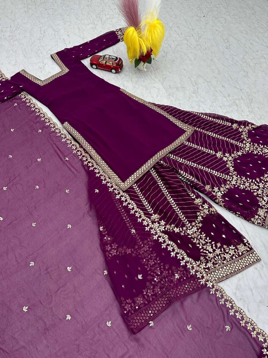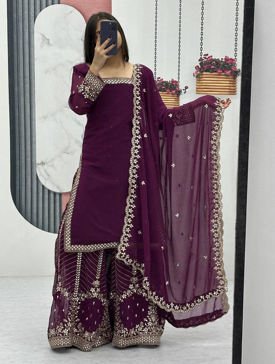 DESIGNER GEORGETTE EMBROIDERY SEQUENCE WORK TOP PALAZZO WITH DUPATTA WINE