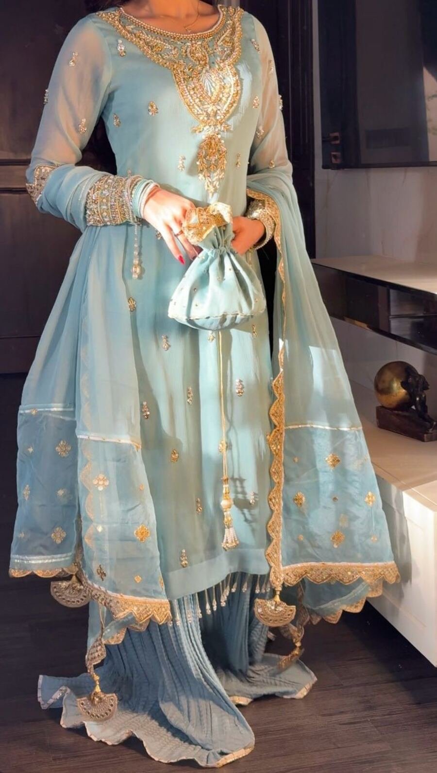 DESIGNER GEORGETTE EMBROIDERY SEQUENCE WORK WITH BEADS WORK TOP PALAZZO WITH DUPATTA SKY