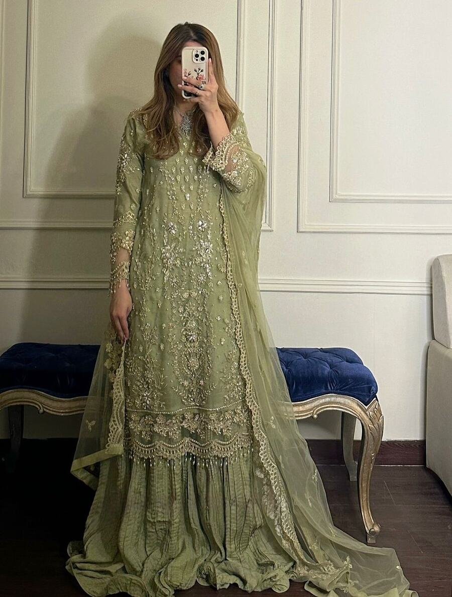 WORK : HEAVY EMBROIDERY 5 MM SEQUENCE WORK WITH RIVET MOTI WORK (SLEEVES WITH FANCY LATKAN BORDER )