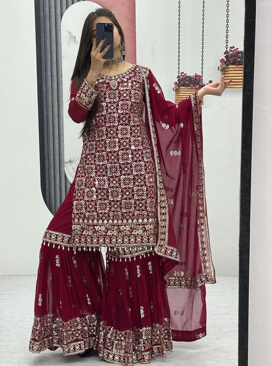 DESIGNER GEORGETTE EMBROIDERY THREAD AND SEQUENCE WORK TOP SHARARA WITH DUPATTA MAROON