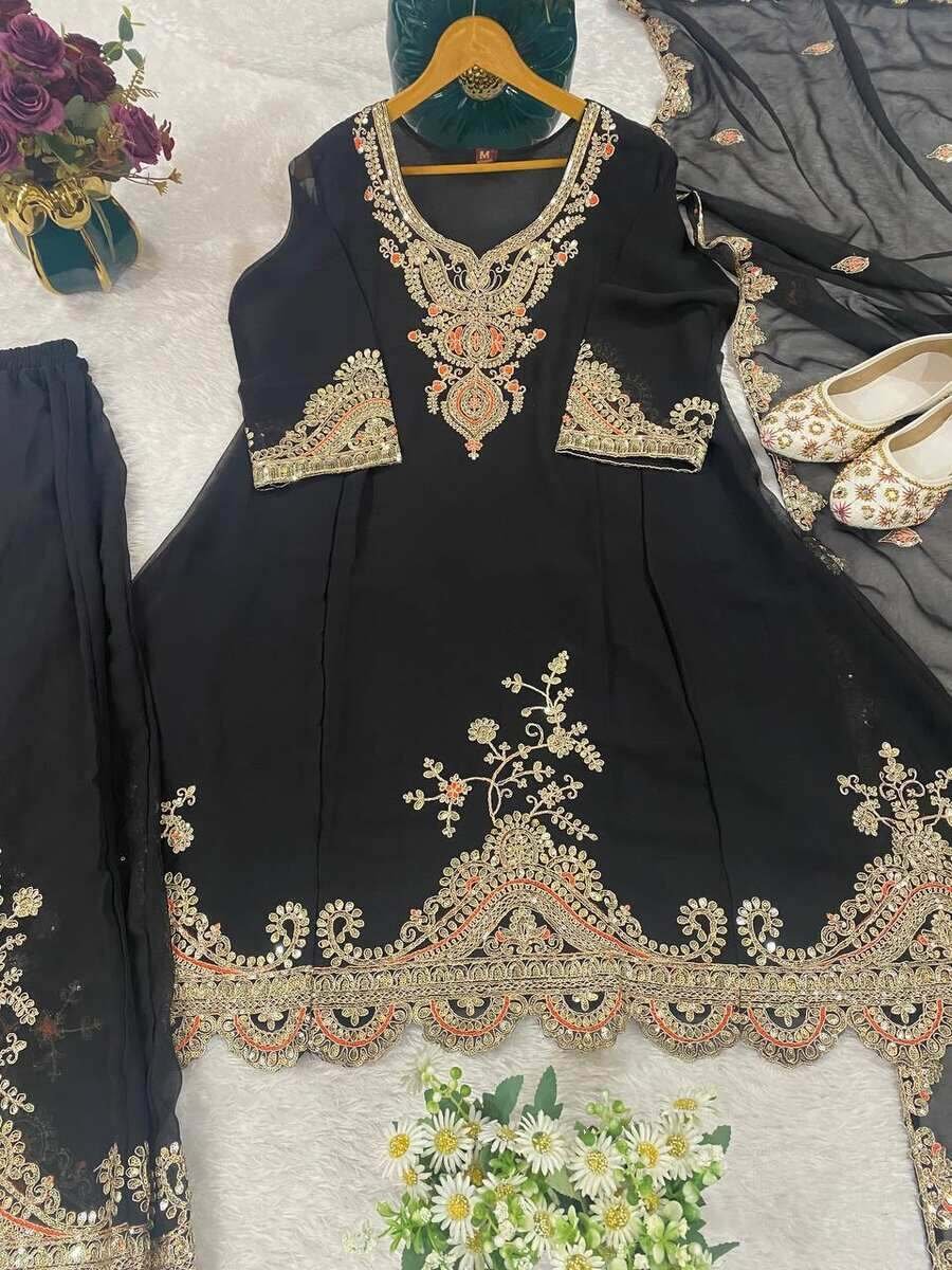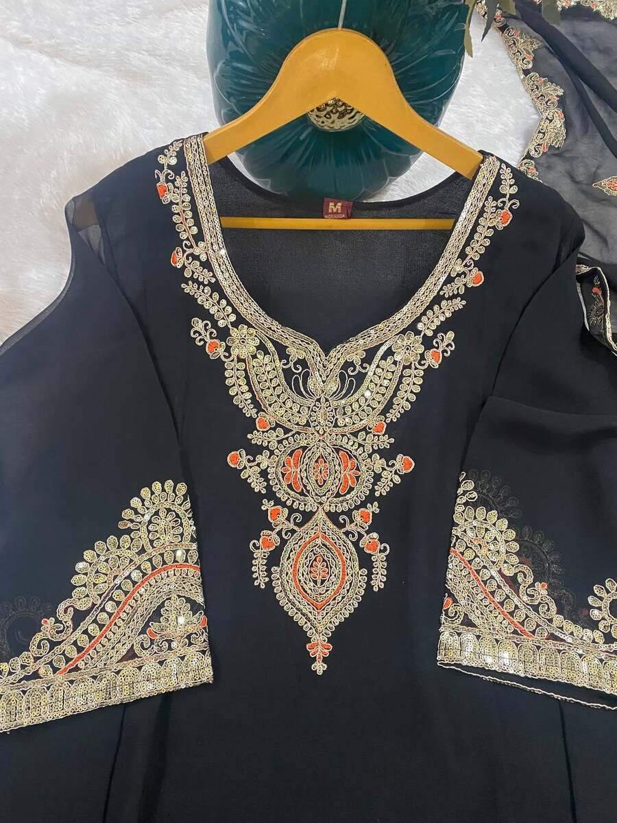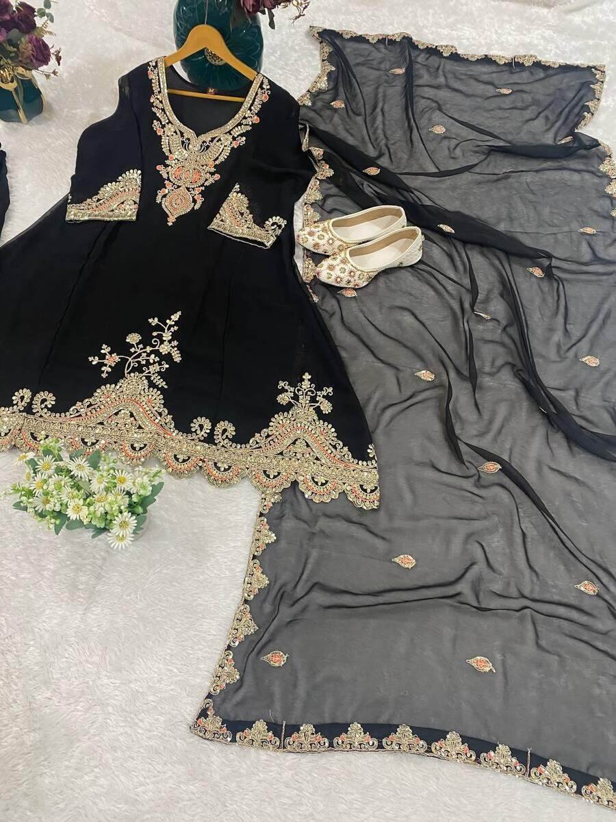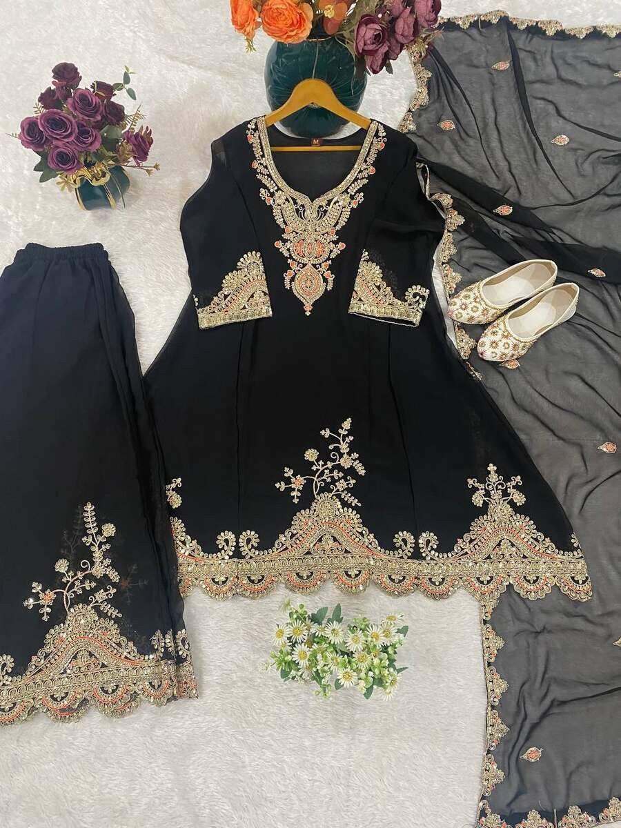 DESIGNER GEORGETTE EMBROIDERY WITH THREAD AND SEQUENCE WORK TOP PALAZZO WITH DUPATTA BLACK