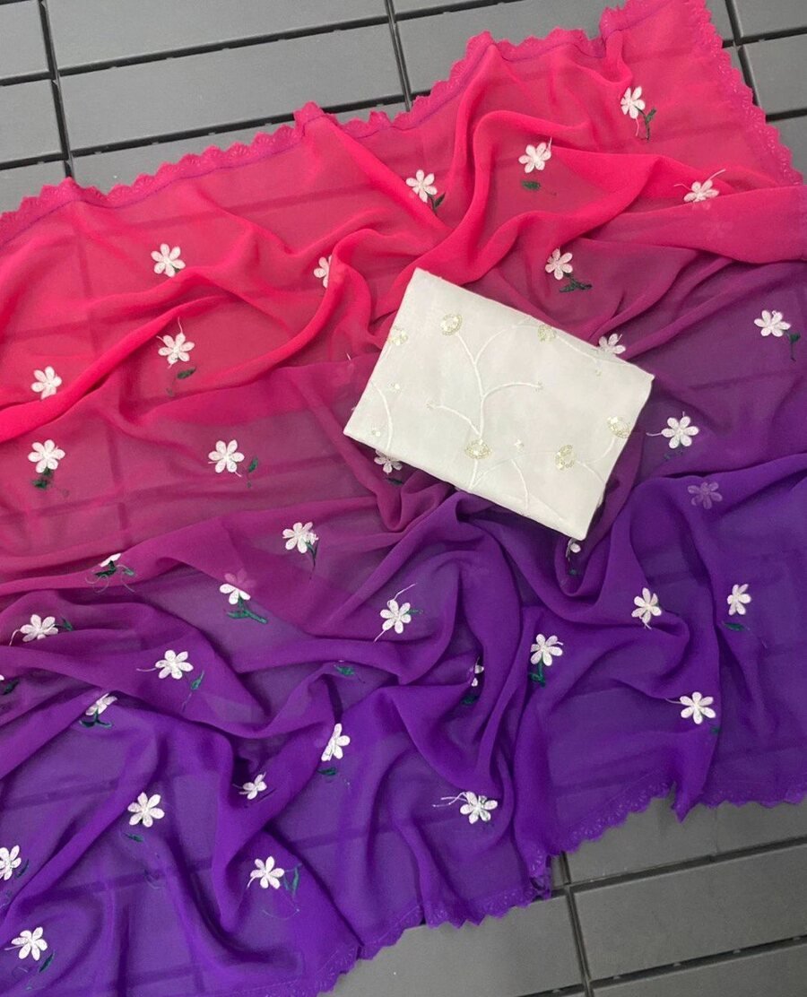 SAREE FABRIC :- GEORGETTE BLOOMING WORK SAREE WITH EMBROIDERY WORK IN ALL OVER SAREE WITH BEAUTIFUL WHITE AND WHITE COCO GOLD COMBINATIONS FUMKA ON PALLU