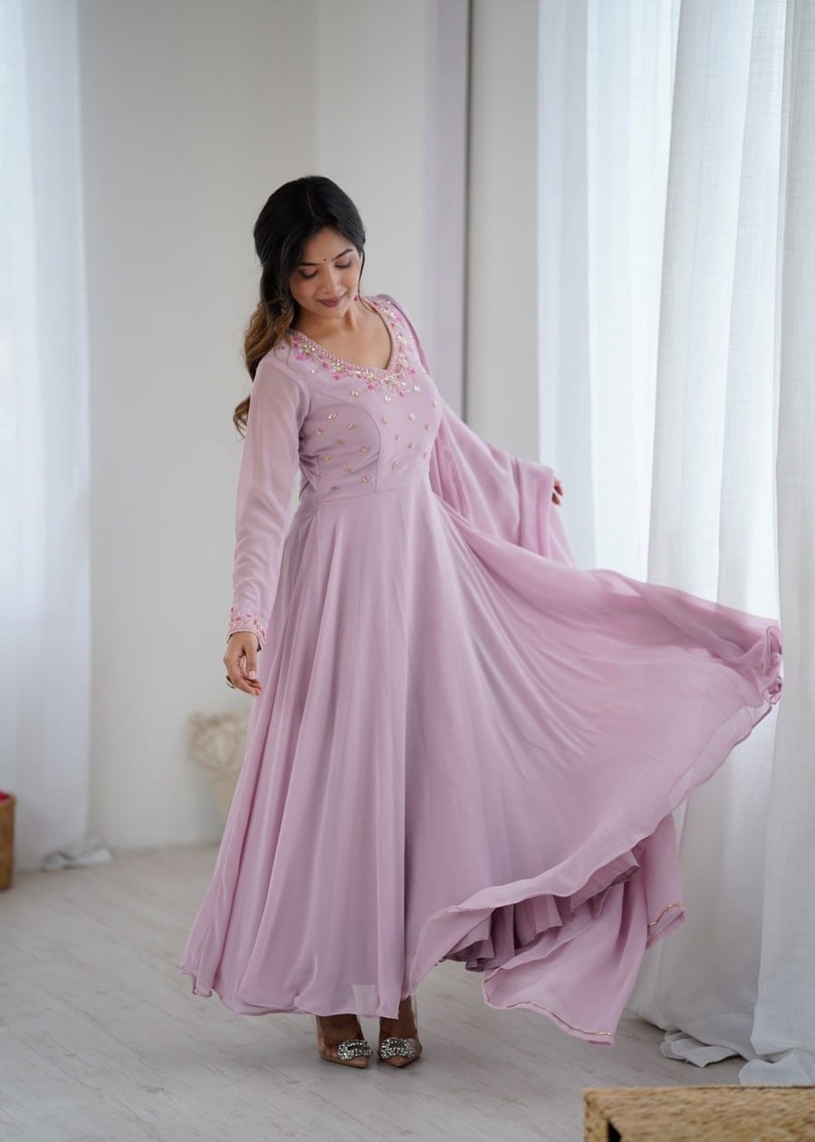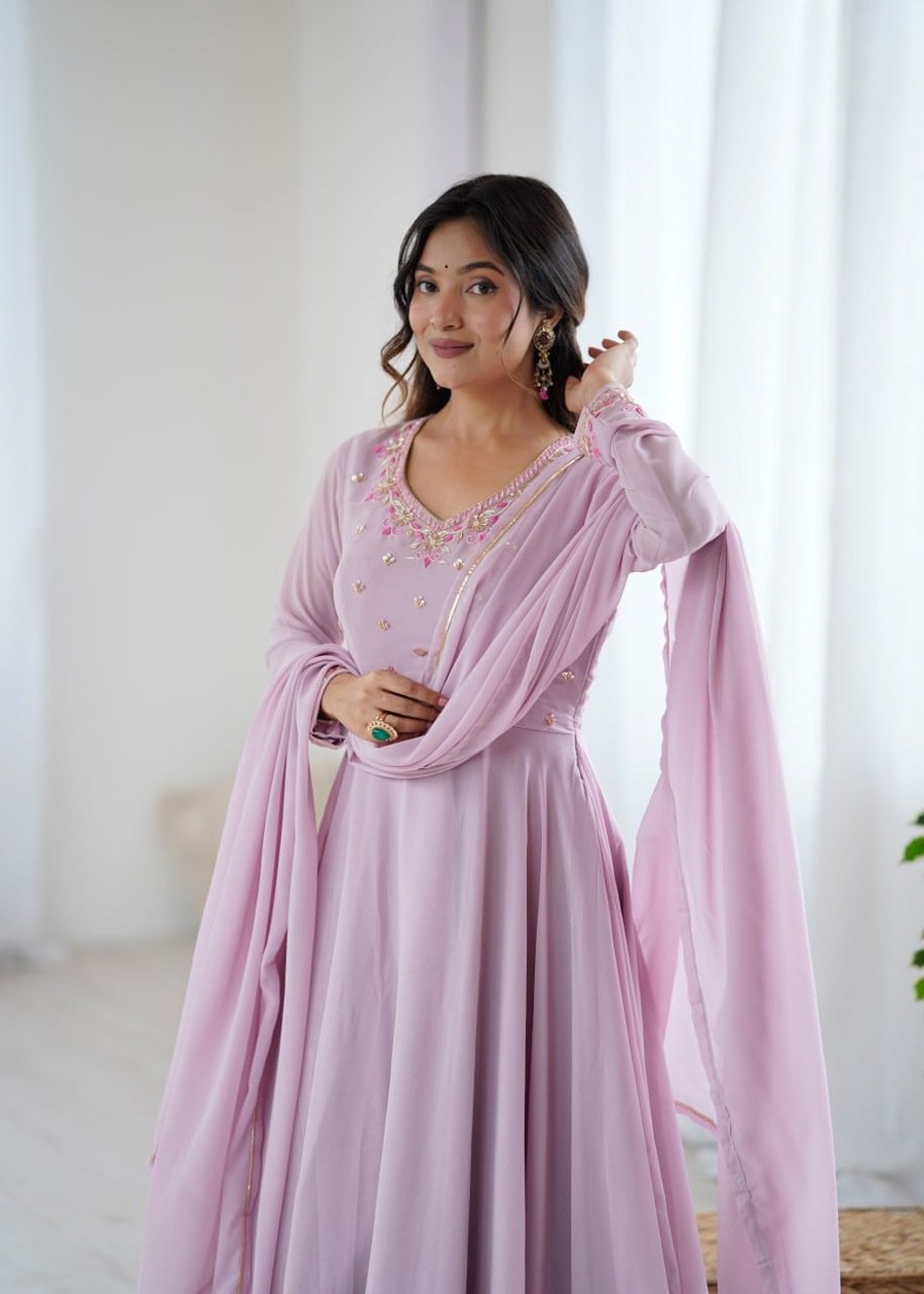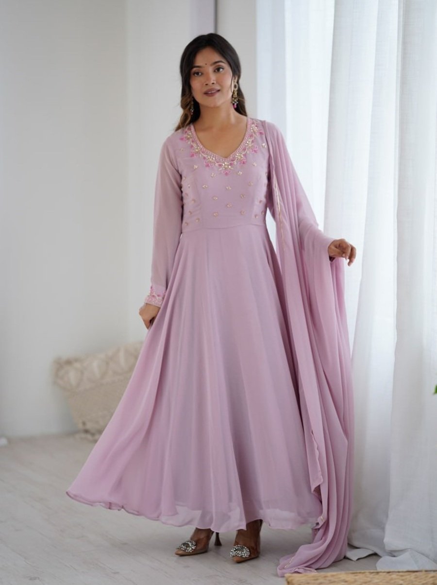 DESIGNER GEORGETTE HANDWORK GOWN BOTTOM WITH DUPATTA LAVENDER
