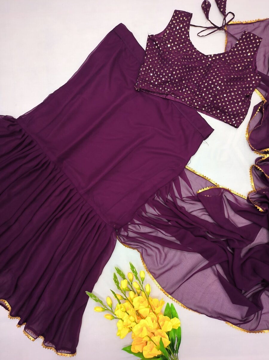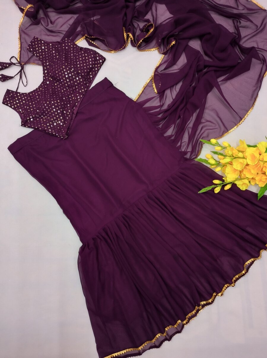 LEHENGA SAREE :- FAUX GEORGETTE WITH PALLU ATTACHED AND FANCY LACE BORDER