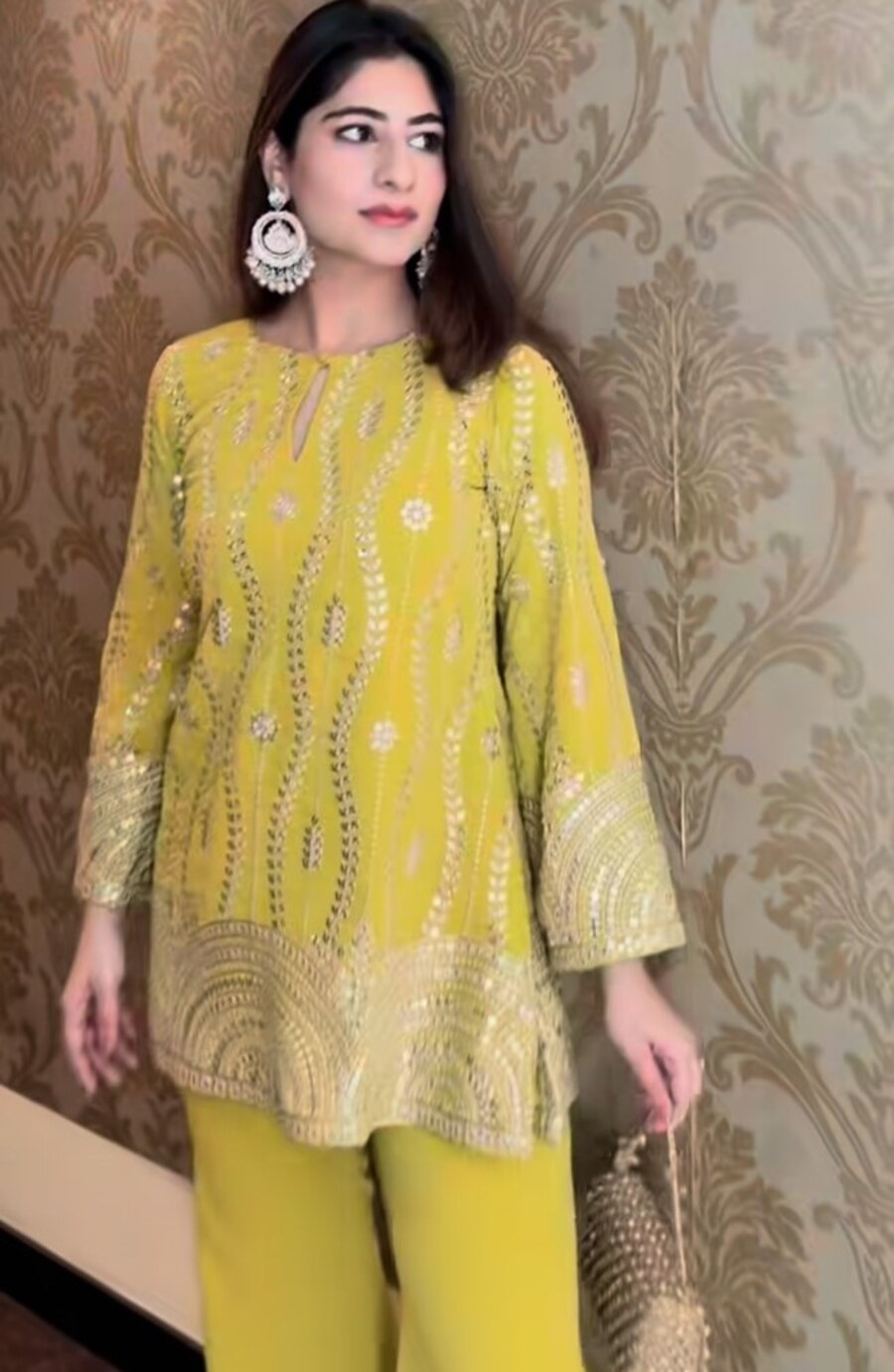 DESIGNER GEORGETTE SEQUENCE EMBROIDERY WORK TOP PALAZZO PARROT GREEN