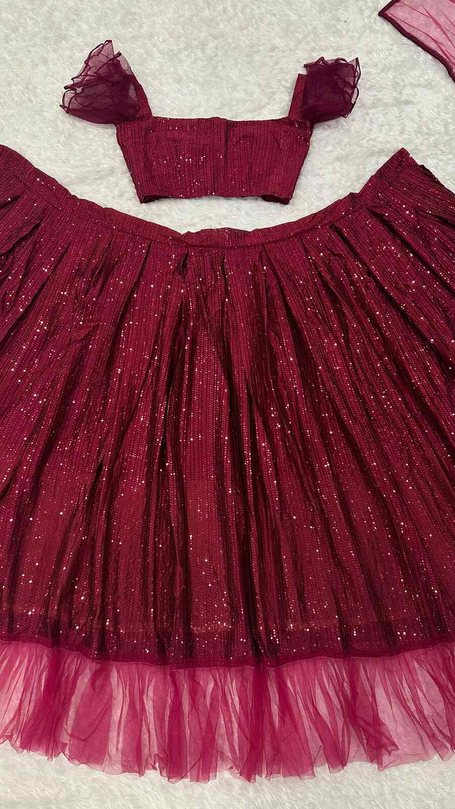 DESIGNER GEORGETTE SEQUENCE RUFFLE WORK LEHENGA CHOLI WITH DUPATTA MAROON