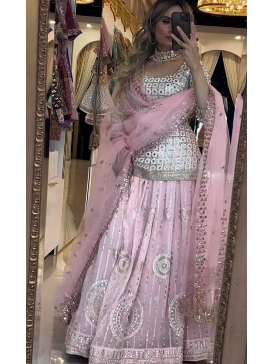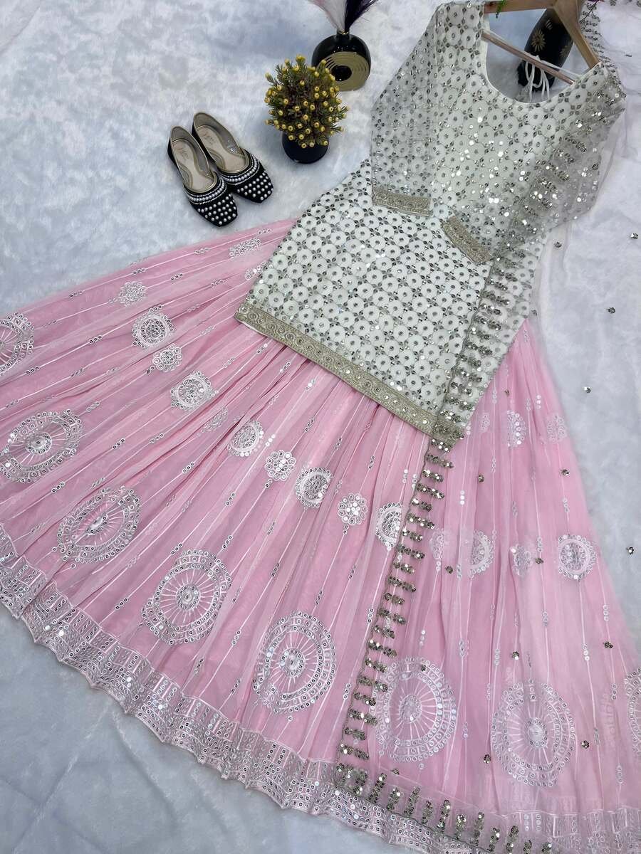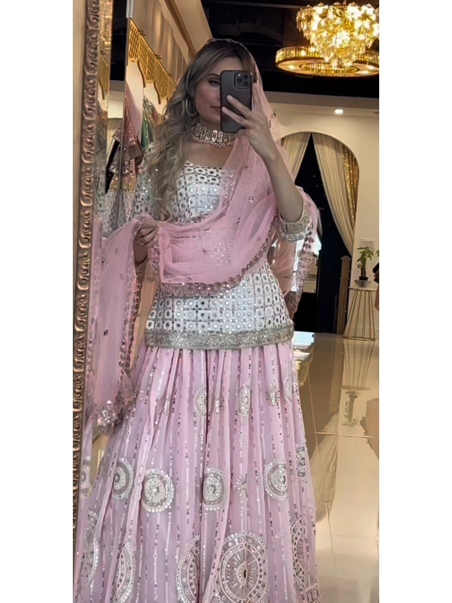 DESIGNER GEORGETTE SEQUENCE WORK MULTI NEEDLE EMBROIDERY AND ZARI WORK TOP LEHENGA WITH DUPATTA BABY PINK